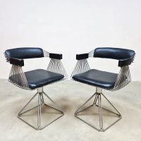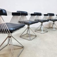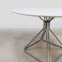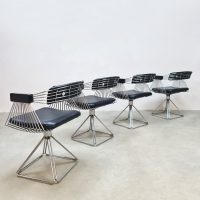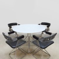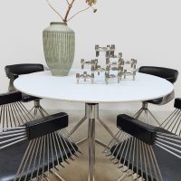 Een prachtige zeldzame complete eetkamerset, een ontwerp van Rudi Verelst voor Novalux. Land van herkomst: België. Periode: jaren 70. Deze vintage design eetkamertafel met bijbehorende stoelen hebben een unieke vormgeving door zijn Pyramide vormige metalen frame. Dit ontwerp is echt een lust voor het oog en een must have voor de kenner. Gezien de leeftijd in een goede vintage conditie. Owners favorite. It’s dinner time!