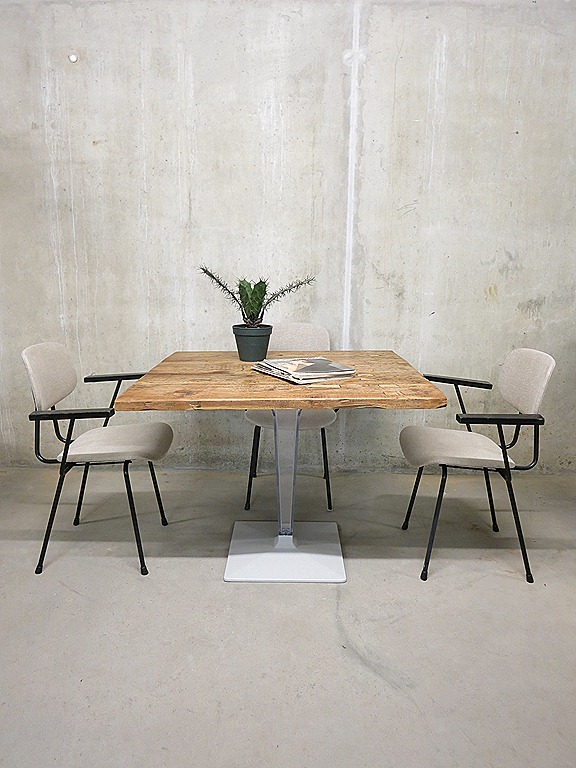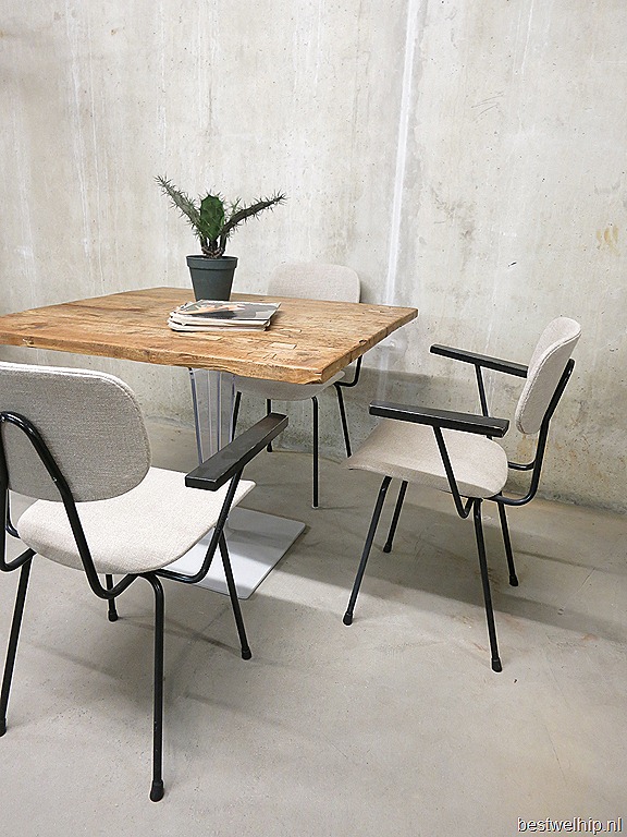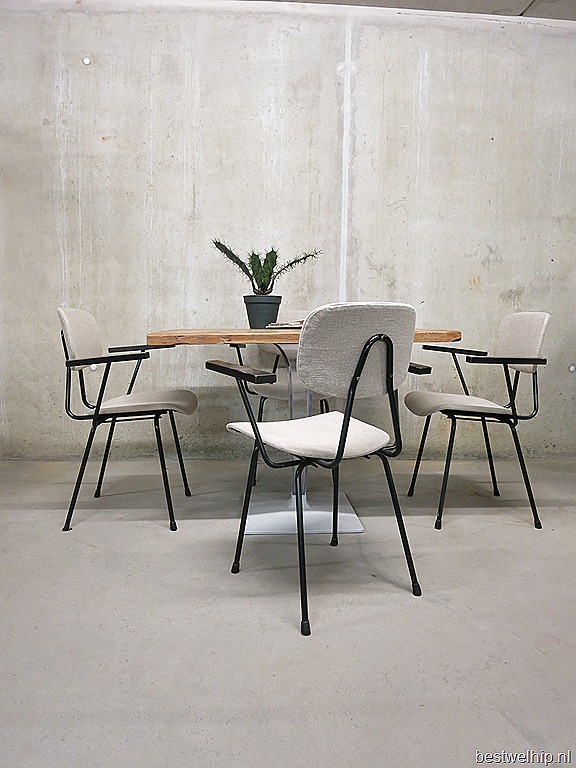 Stoer maar toch elegant deze 4 mooie Kembo stoelen, een ontwerp van W.Rietveld. Periode: begin jaren 50. Materiaal: zwart metalen buizen frame, houten armleuningen, ecru kleurige zitting en rugleuning. Volledig opnieuw gestoffeerd. Gezien de leeftijd in goede vintage staat. Mooi door zijn minimalistische vormgeving. Tijdloos, stoer & stijlvol tegelijker tijd.