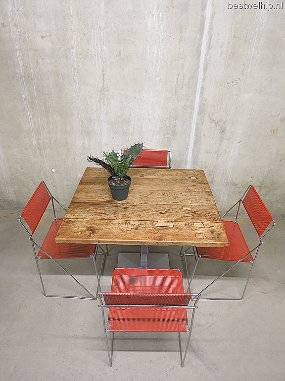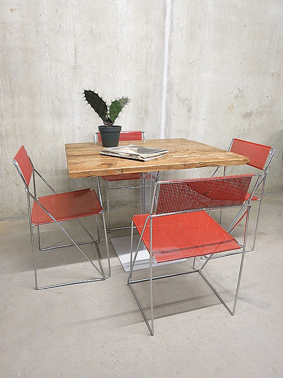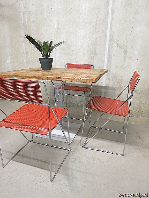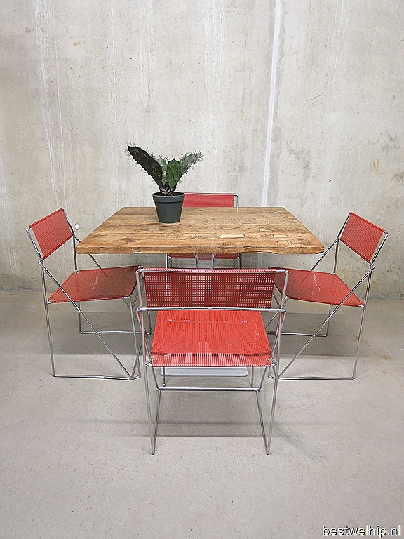 Mooi van eenvoud…de Scandinavische X-line chair van Niels Jørgen Haugesen. Periode: jaren 70/ 1977. Een prachtige stoel die steeds zeldzamer wordt. Materiaal chromen frame met geperforeerde metalen zitting/ rug. Kleur: rood. Gezien de leeftijd nog in goede vintage staat. Makkelijk op te bergen omdat deze stapelbaar zijn. Uniek dat er 8 identieke stoelen beschikbaar zijn. Prachtig voor bij je thuis of voor in je restaurant of hotel.