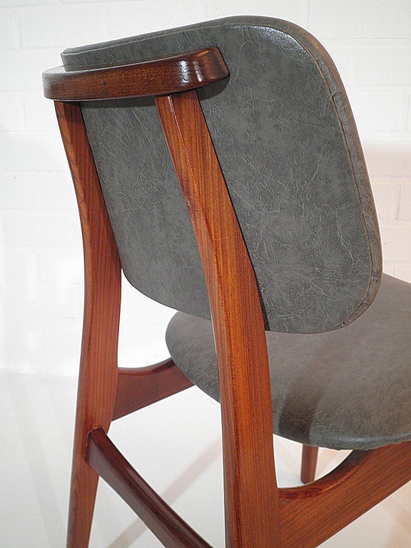 Een prachtige set van 4 eetkamerstoelen in Deense stijl. Ontwerper onbekend. Doen denken aan de stoelen van Hovmand Olsen/ Webe. Stoelen uitgevoerd in een frame van massief teakhout en mooie stijlvolle rugleuning van teakhout.Op de zitting en rug zit nog het originele grijzen skai. Aan de achterkant voorzien van een soort ‘handvat’ handig om ze hieraan vast te pakken. Ze hebben een erg comfortabele zit. Nog in zeer goede vintage staat. Absoluut een eye-catcher in je woonkamer. Zijn deze stoelen net wat jij zoekt? Prijs: verkocht