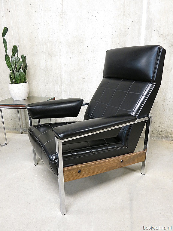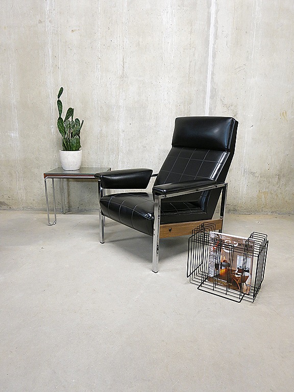 Prachtige/ stoere, in een zeer goede staat verkerende vintage fauteuil/ armchair van Fabrikant Gelderland, ontworpen door Rob Parry . Periode: jaren 60/70. Materiaal: zwarte skai leren bekleding, chroom met houten frame, de zijplank heeft een bijzondere houttekening. Afmetingen: B0.71 x D0.83 x H0.93 cm, zithoogte 40 cm, zitdiepte 50 cm. Zoek jij nog die speciale vintage stoel om een lounge hoek in je hotel mee in te richten, een café/ restaurant of gewoon heerlijk voor thuis. Nog in zeer goede vintage staat. Een zeer bijzondere vintage stoel, stijlvol maar toch ook stoer! Prijs: verkocht