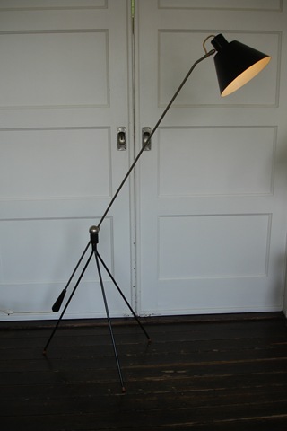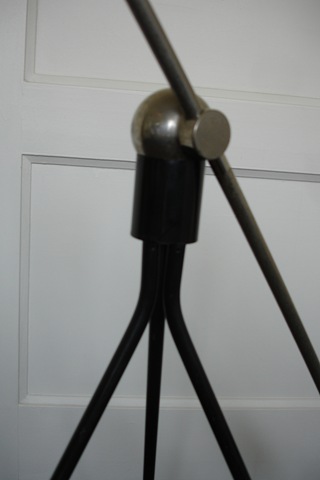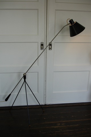 Prachtige vintage design hengellamp, de Magneto vloerlamp van H. Fillekens op de driepikkel" uit 1957 geproduceerd door Artiforte uit Rotterdam. De naam van de lamp is vernoemd naar de magneet die in de driepoot ingebouwd zit en die nauwkeurig de stalen bol op zijn plaats houdt. Hierdoor is de lamp vlot 360 graden te roteren in alle richtingen. Zeer apart mechanisme waarbij de ‘hengel’ rust op de voet door middel van de roterende magnetische bol. Deze vloerlamp is strak vormgegeven en heeft een industriële look! Afmetingen: lengte van de hengel inclusief lamp is 1.50 meter, diameter kap is 23 cm. Materiaal: chroom metalen arm & chromen magneet bol. In goede vintage staat. Deze unieke lamp brengt je interieur naar een hoger niveau. Prijs: verkocht /sold