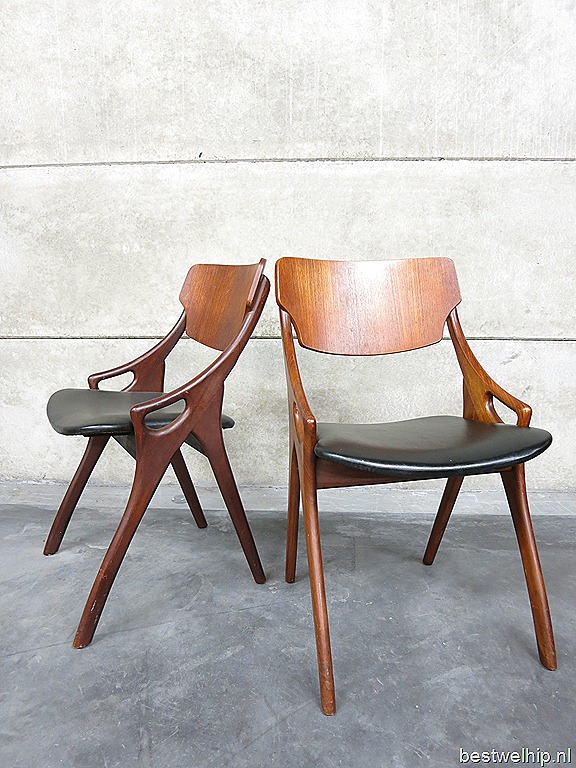 Het blijven unieke stoelen deze Deense design stoelen. Een ontwerp van Arne Hovmand Olsen. Fabrikant: Mogens Kold Furniture. Periode: 1960. Deze stoelen hebben een prachtige typische Deense vormgeving. De handvaten aan de stoel zijn een zeer mooi detail. Materiaal: teak hout plywood, zwart skai leren zitting. Afmetingen: H 82 x B50 X D41 cm. Gezien de leeftijd nog in zeer goede vintage staat. Deze prachtige set is absoluut een lust voor het oog. Prijs: verkocht