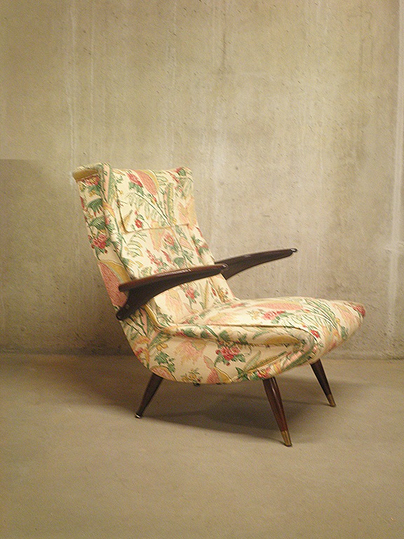 Door zijn zwevende armleuningen absoluut een bijzondere lounge- club fauteuil in Deense stijl. Periode: jaren 50. Bijzonder karakteristieke vormgeving van de armleuningen. Materiaal: print bekleding van Laura Ashley en een glanzend houten frame. Afmetingen: H0.87 x D0.78 x B0.62 cm, zithoogte 0.39 cm, zitdiepte 0.54. Gezien de leeftijd in goede vintage staat, uiteraard heeft de stof een doorleefde look, eventueel te bekleden in een stof passend bij je interieur. Een zeer karakteristieke stoel door zijn speciale vormgegeven armleuningen met een tijdloos karakter. Prachtig in zowel een een modern als vintage interieur! Dit model ben ik nog niet eerder tegengekomen. Prijs: verkocht