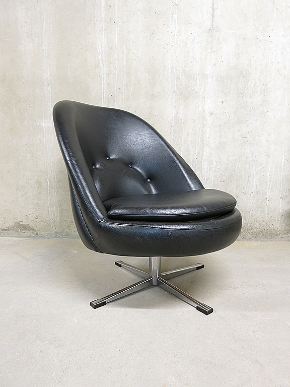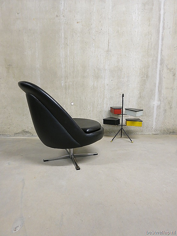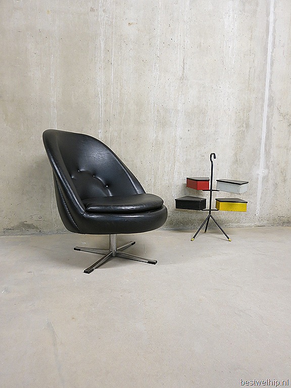 Zeer bijzondere vintage kuipstoel / draaifauteuil uit de jaren 50. Ontwerper: onbekend, doet denken aan Rohe Noordwolde. Prachtig vormgegeven met een comfortabele zit en voorzien van zwaar chromen ster poot. Gezien de leeftijd nog in zeer goede vintage staat. Ideaal te plaatsen door zijn beperkte afmetingen, H0.83 x D0.88 x B0.65cm, zitdiepte 0.55 cm, zithoogte 0.40 cm. Deze ‘Globe’ lounge stoel oogt ruimtelijk in de kamer door zijn vormgeving. Een stoere stijlvolle kuipstoel met een heerlijk zitcomfort. Ideaal om bij te zetten en om relaxed om een boekje in te lezen. Easy going…. Prijs: verkocht