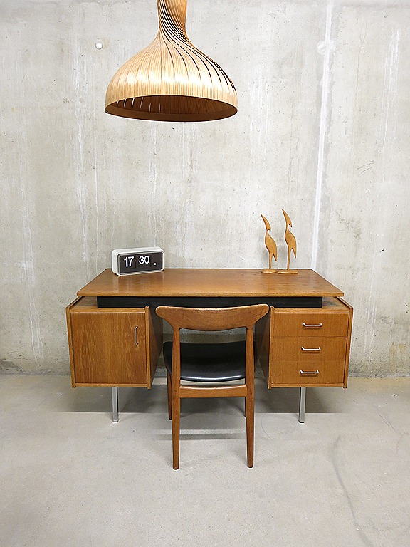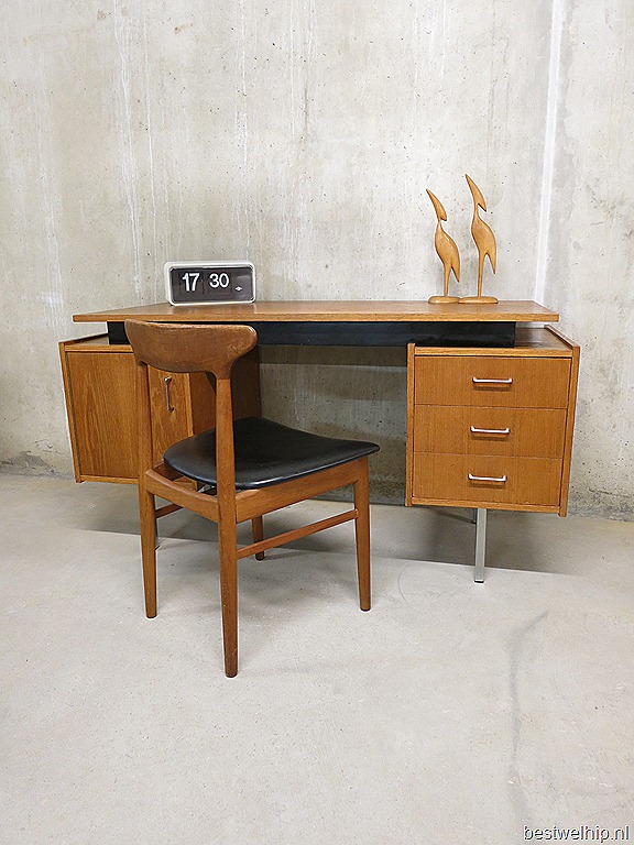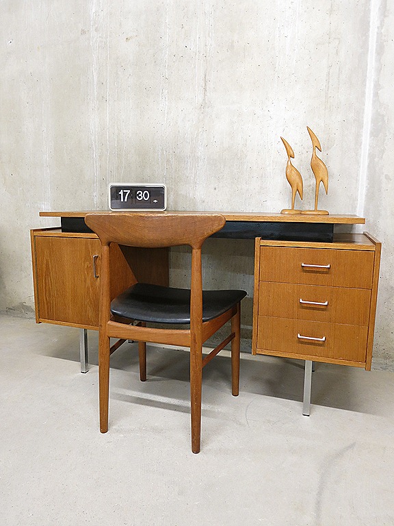 Zeer strak en stoer vintage design bureau – writing desk van Pastoe. Een ontwerp van Cees Braakman. Periode: jaren 50. Een strak ontwerp met een optisch zwevend blad. Materiaal: houten blad en ladenblokken, metalen chroom accenten in de handvaten & poten. De strakke vormen en contrasterende materiaalkeuze maken van dit bureau een eigentijds ontwerp. Afmetingen: B1.44 x D0.61 x H0.76 cm. De breedte van het bureaublad is 1.32 cm. Gezien de leeftijd nog in goed gebruikte vintage staat. Past dit bureau perfect bij jou thuis, winkel of op kantoor? Prijs: verkocht