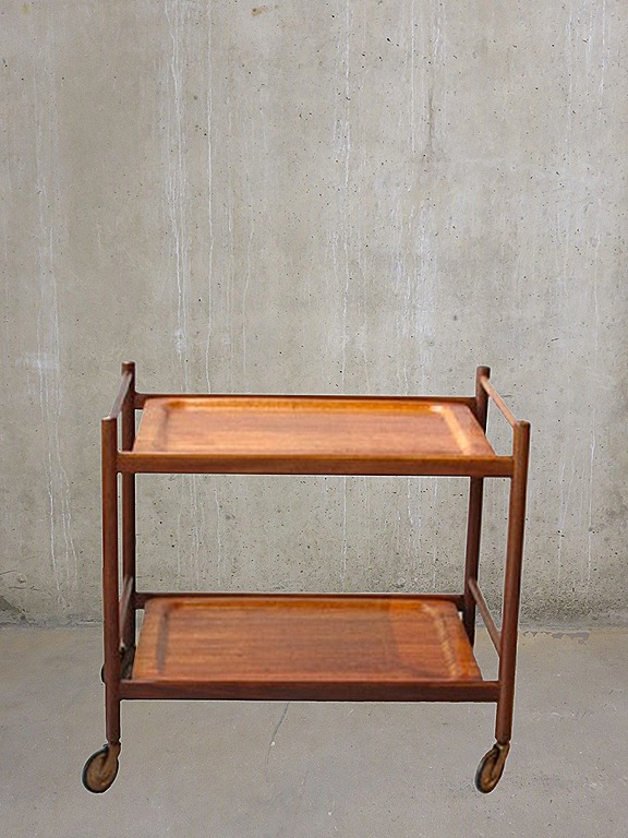 Prachtige vintage design theewagen/serveerwagen op zwenkwielen in Deense stijl. Producent: Pastoe, ontwerper onbekend. Periode: jaren 60. Ook ideaal om te gebruiken als bijzettafel / side table in de woonkamer of lobby van een hotel/restaurant/bar. Afmetingen: H63 x B69 x D44 cm. Gezien de leeftijd nog in goede originele vintage staat. Voorzien van de originele afneembare houten dienbladen. Een bijzonder en uniek mid century vintage design exemplaar.