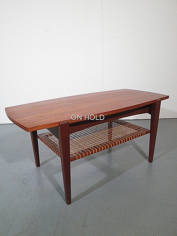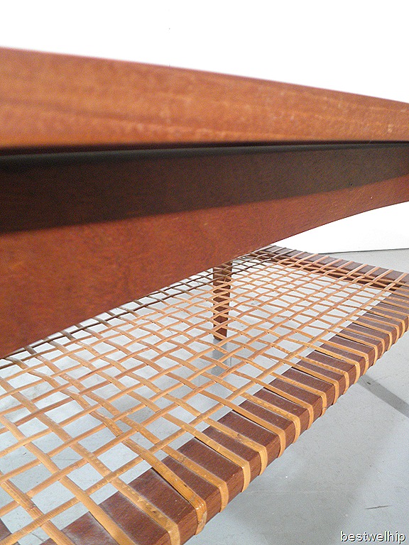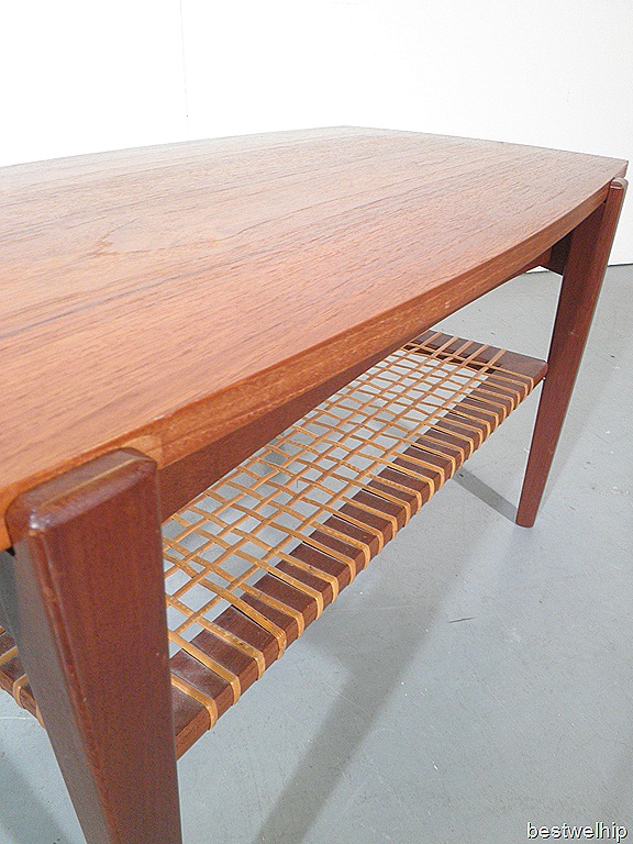 Bijzonder door zijn eenvoud is deze vintage salontafel in Deense stijl. Het onderblad ‘webbing’ is nog in uitzonderlijke goede staat. Materiaal: teak hout. Het blad is omkeerbaar, de andere zijde is wit formica. Afmetingen: L1.00 x B0.50 x H0.44 cm. Een ideale salontafel en/of bijzettafel voor in elk interieur.