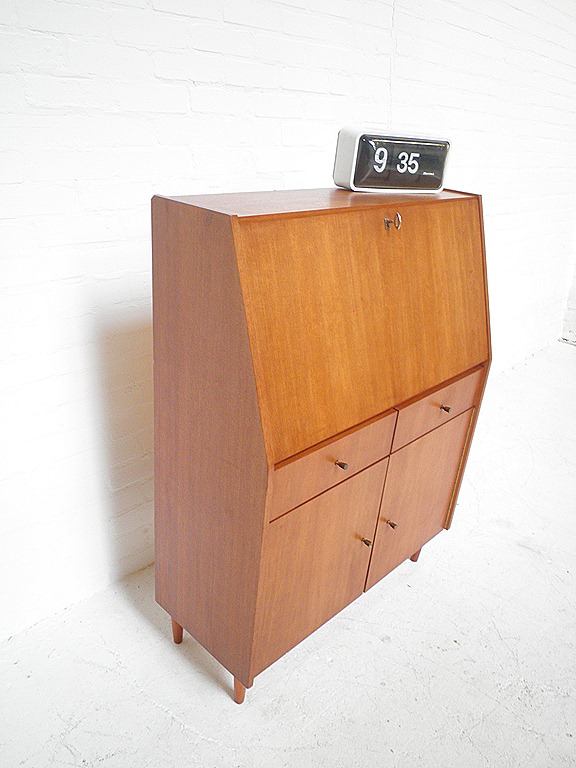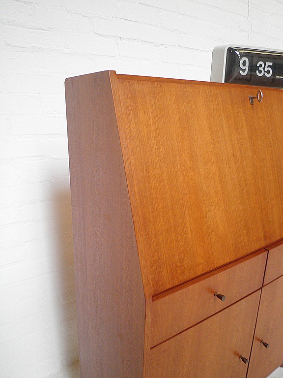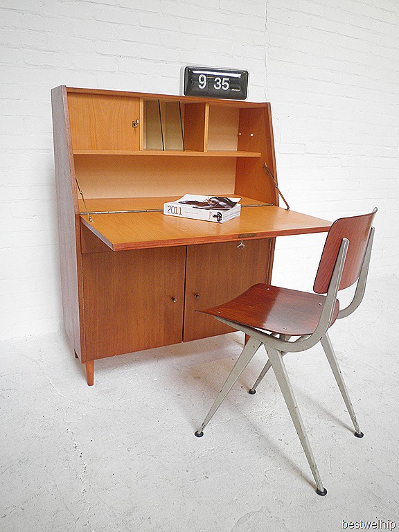 Krijgt deze vintage design secretaire straks een mooi plekje bij jouw in je interieur? Prachtige bureaukast uitgevoerd in teakhout. Voorzien van uitklapbare klep, bijzondere vak-indeling van binnen en voorzien van 2 lades en 2 deuren. Dus voldoende mogelijkheid tot opbergruimte. Periode: 1960. Door de Scandinavische stijl is dit meubel absoluut helemaal hip. Afmetingen: B90,5 x D0.36 x H1.19 cm. Ideaal door zijn beperkte afmetingen. Uitgeklapt is de diepte van het werkblad 0.76 cm. In zeer goede vintage conditie.Prijs: verkocht