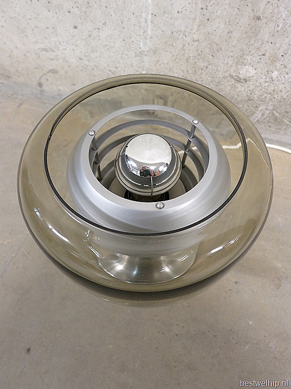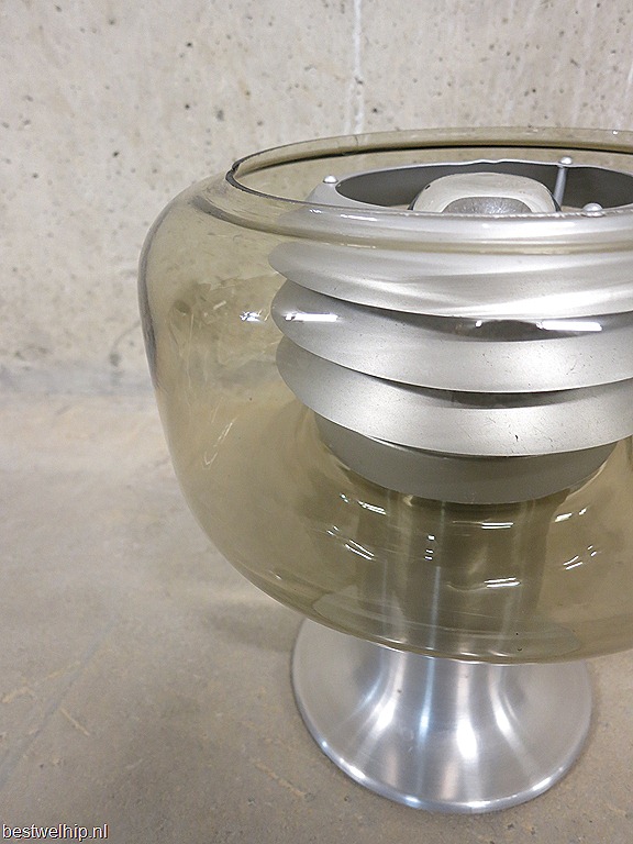 Zeer bijzondere tafellamp met een geborstelde aluminium voet & aluminium lamellen, voorzien van glazen kap. Ontwerper: waarschijnlijk Hans Agne Jacobsson. Periode: jaren 60. Materiaal: licht gewicht aluminium voet en lamellen, glazen kap, kopspiegel lamp. Afmetingen: Hoogte 26 cm, diameter 23 cm. Gezien de leeftijd nog in goede vintage staat, enkel een heel klein chipje uit het glas aan de bovenkant, maar valt minimaal op. Oogt zeer ruimtelijk, mooi in zowel een vintage als in een strak modern interieur. Prijs: verkocht