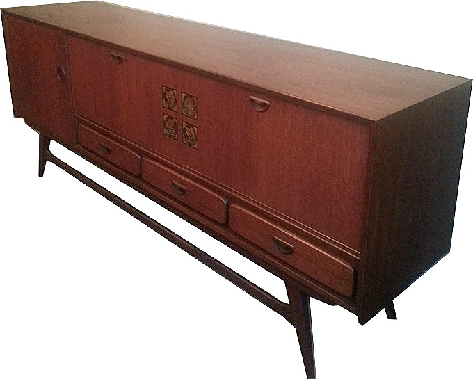 Zeer mooi vintage design dressoir ontworpen door Louis van Teeffelen voor Wébé meubelen uit de jaren. Het dressoir is uitgevoerd in teakhout en heeft aan de voorzijde 4 tegeltjes die ontworpen zijn door de keramist J. Ravelli. Zeer fraai gevormde organische poten. Voorzien van 3 lades beneden en 3 deurtjes. Afmetingen: L2.00 x D0.48 x H0.85 cm. Het dressoir verkeert in een zeer goede staat gezien zijn leeftijd. Prachtig om neer te zetten, veel opbergmogelijkheid en bijzondere details zoals de ‘smiley’ handgrepen ( zeer herkenbaar voor Webe) Dit Dutch design dressoir is absoluut een lust voor het oog. Mooi in zowel een vintage als modern interieur!