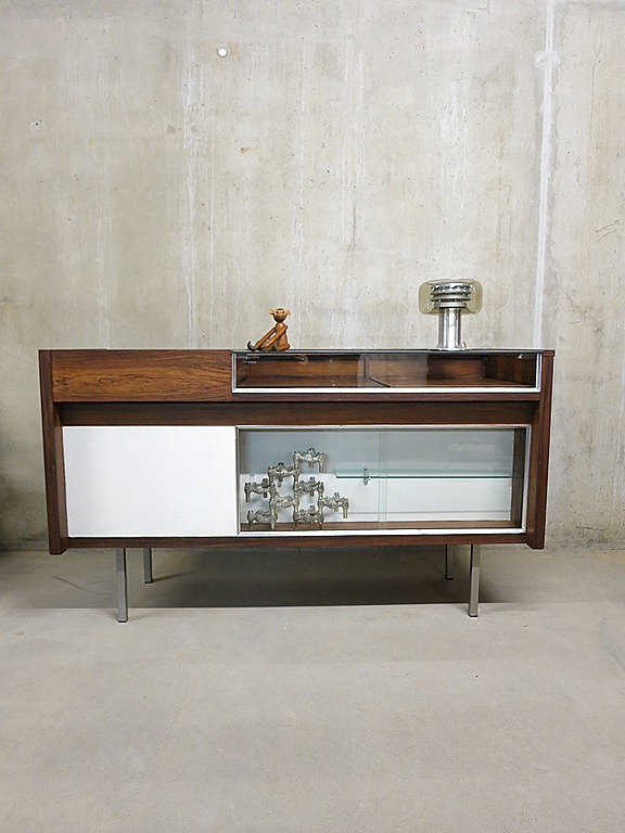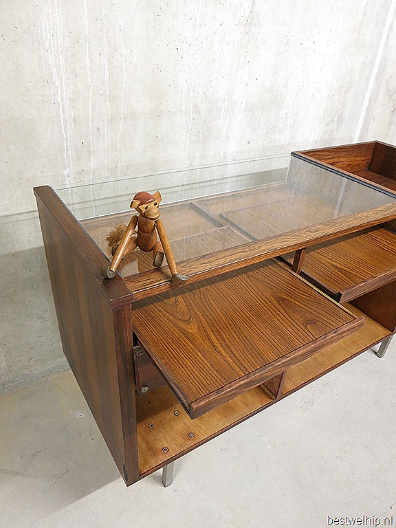Deze prachtige authentieke toonbank mag je absoluut niet missen. Periode: jaren 60/70. Materiaal: palissander hout in combinatie met glas vitrines, metalen chromen poten & handgrepen. Gezien de leeftijd nog in zeer goede vintage staat. De achterkant is voorzien van 2 lades , legvakken en 2 bijzonder mooie uitschijfbare vitrine platen. Afmetingen: B1.50 x D0.54 x H0.89 cm. Heb jij net die hippe winkel geopend en zoek je nog een authentieke originele vintage toonbank? Of ben jij al een tijdje opzoek naar die bijzondere vitrinekast om je verzameling in tentoon te stellen? Absoluut een eye-catcher in je interieur. Prijs: verkocht