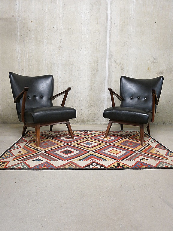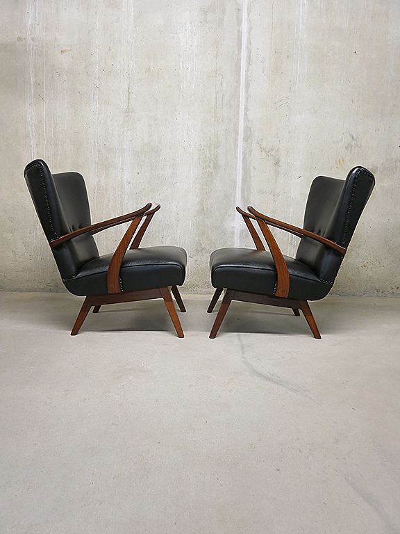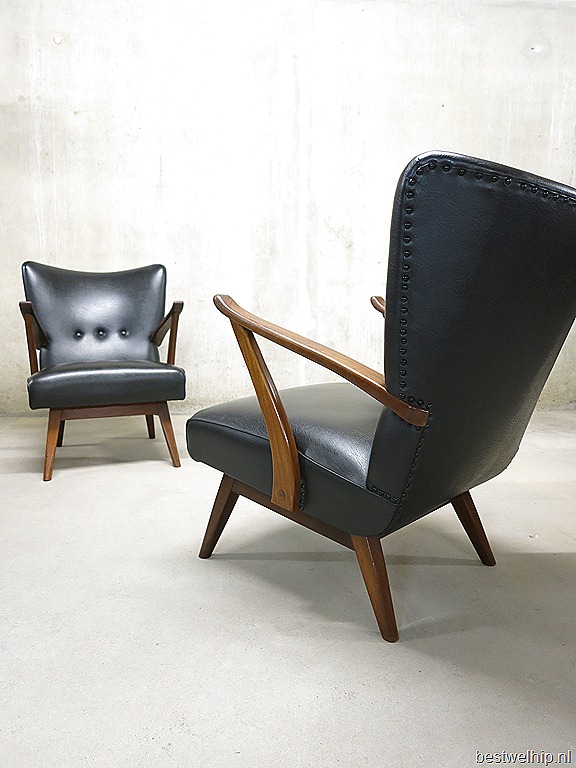 Uniek & ‘one of a kind’…deze twee stijlvolle vintage design easy chairs uit de jaren 50. Ook wel wingback chairs genoemd. Fantastische vormgegeven, prachtig in een set van 2 identieke fauteuils Ontwerper: onbekend. Materiaal: houten frame & zwarte skai leren bekleding. Zeer bijzonder vormgegeven vintage design lounge fauteuils. . Afmetingen: H84 x B62 x D80, zithoogte 38 cm, zitdiepte 50 cm. Gezien de leeftijd nog in zeer goede vintage staat. Absoluut een bijzondere lounge set met een zeer comfortabele zit. Prachtig in zowel een vintage als modern interieur. Mooi door zijn eenvoud en strakke vormen. Prijs: verkocht