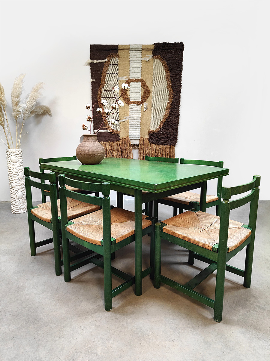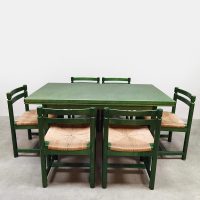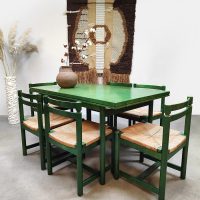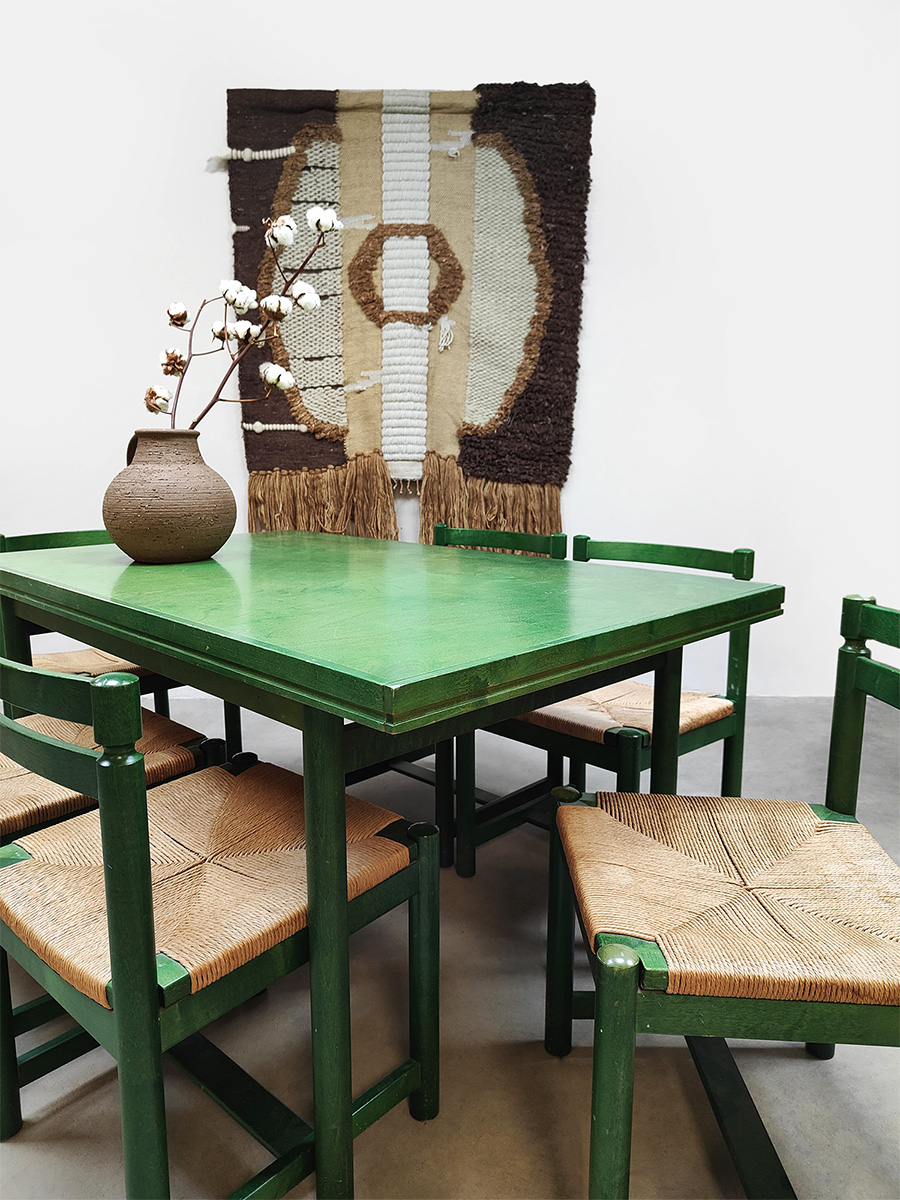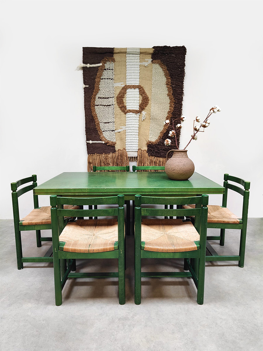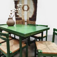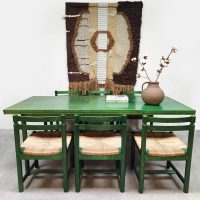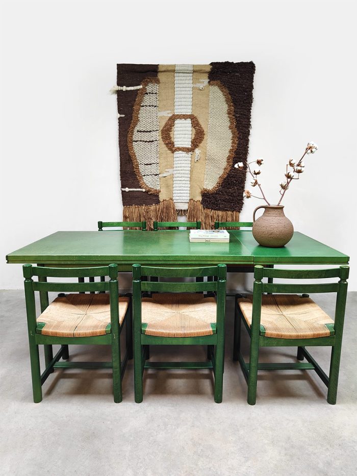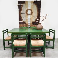 Haal buiten naar binnen met deze kleurrijke groene vintage eetkamerset. Net even anders dan anders. Geproduceerd door Asko. Land van herkomst: Finland. Periode: 1970. De eetkamertafel is strak vormgegeven & in één handomdraai te verlengen, zodat deze geschikt is voor meerdere personen. Uitschuifbaar naar 185 cm. De uitschuifbare tafel en de stoelen zijn net een beetje lager dan normaal. Maar niet getreurd want ‘low dining’ is weer helemaal terug van weggeweest! Gezien de leeftijd in een goede gebruikte vintage staat. Enkele kringen/sporen op de touwzitting van de stoelen. Desalniettemin een kleurrijke en frisse set voor in huis. Is deze eethoek precies wat jij zoekt? Dare to be different!