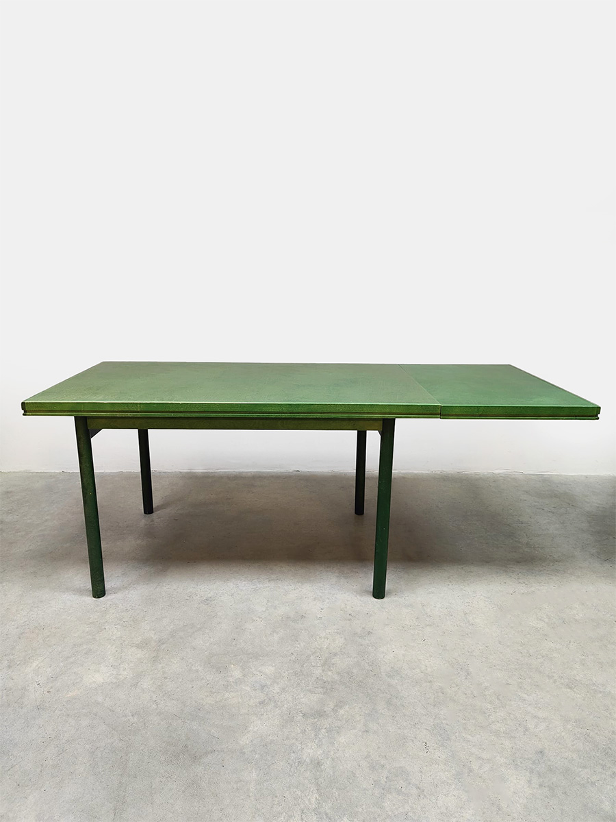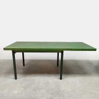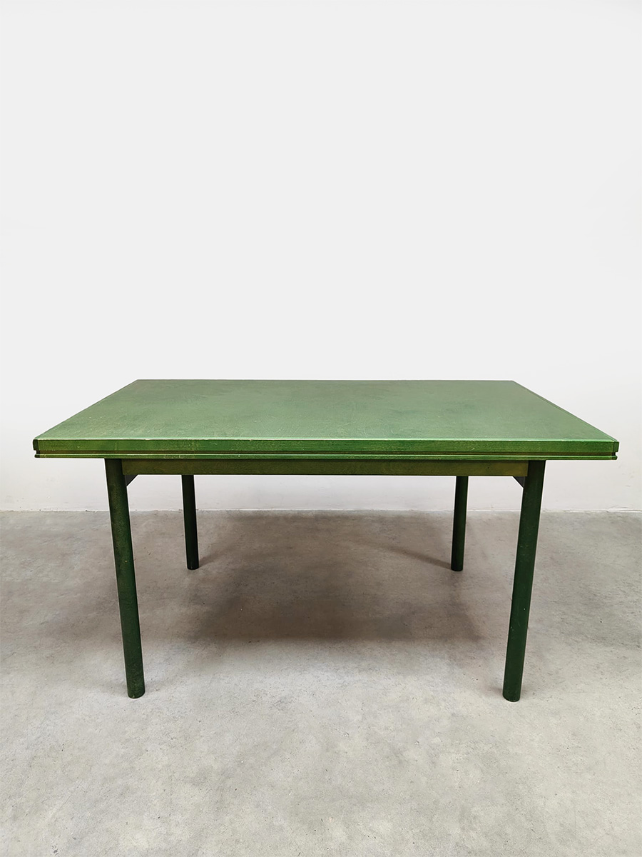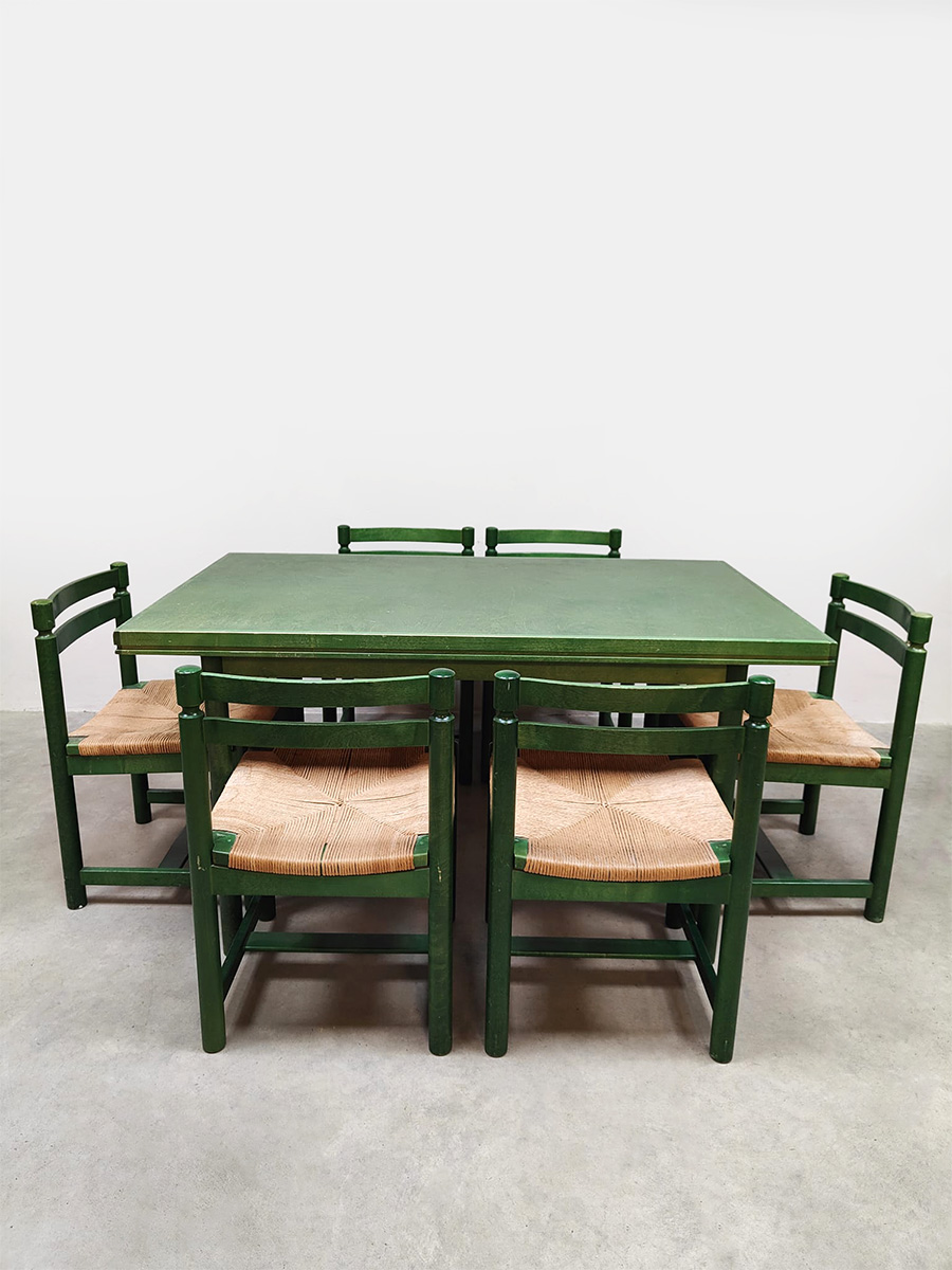 Haal buiten naar binnen met deze kleurrijke groene vintage eetkamerset. Net even anders dan anders. Geproduceerd door Asko. Land van herkomst: Finland. Periode: 1970. De eetkamertafel is strak vormgegeven & in één handomdraai te verlengen, zodat deze geschikt is voor meerdere personen. Uitschuifbaar naar 185 cm. De uitschuifbare tafel en de stoelen zijn net een beetje lager dan normaal. Maar niet getreurd want ‘low dining’ is weer helemaal terug van weggeweest! Gezien de leeftijd in een goede gebruikte vintage staat. Enkele kringen/sporen op de touwzitting van de stoelen. Desalniettemin een kleurrijke en frisse set voor in huis. Is deze eethoek precies wat jij zoekt? Dare to be different!