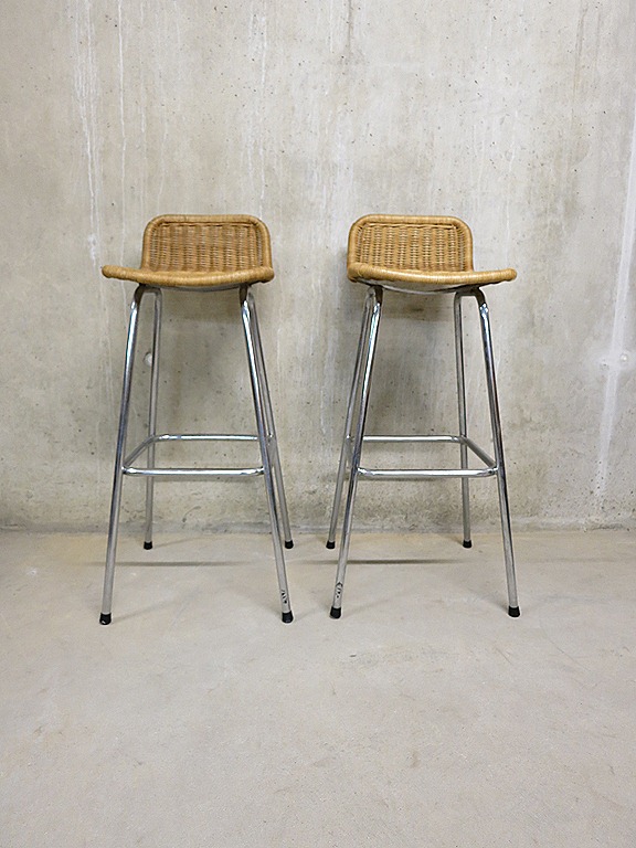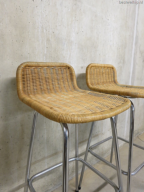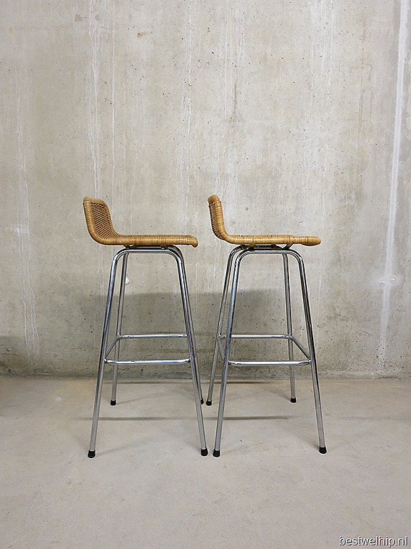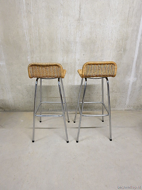 2 prachtige hoge vintage barkrukken uit de jaren 70. Producent: Rohe, Noordwolde. Ontwerper: Dirk van Sliedrecht. Afmetingen: H85 x B41 cm, zithoogte is 75 cm. Materiaal: chromen onderstel en rotan/pitriet zitting. Afmetingen: H0.91x B0.42 x D0.42 cm. Gezien de leeftijd in goede vintage staat ( enige beschadiging aan riet ) In de jaren 40 begint Dirk van Sliedregt te experimenteren met rotan en ontwikkeld enkele stoelen die al snel worden opgepikt door meubelfabriek Gebroeders Jonkers in Noordwolde. Zíjn ontwerpen zijn vaak een combinatie van rotan met metalen buisframe en blinken uit door ogenschijnlijke eenvoud maar zijn bij nadere beschouwing uiterst gecompliceerd. Helemaal leuk voor aan een bar. Prijs: verkocht