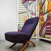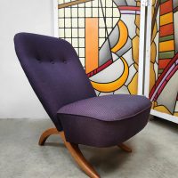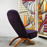 Uniek Dutch design! Deze Congo chair is een klassiek ontwerp van Theo Ruth voor Artifort. Periode: jaren 50. Mooi door zijn eenvoud. Theo Ruth was de pionier van de ontwerp traditie van Artifort. Hij maakte bijzondere ontwerpen zoals deze Congo chair en de Pinguin chair. Bij dit ontwerp heeft hij zich laten inspireren door een stoel uit Afrika en daar heeft de stoel ook zijn naam aan te danken. Nog voorzien van de originele paarse stof. De stoel bestaat uit een houten frame waarbij 2 losse delen in elkaar haken en weer beide los te koppelen zijn. Gezien de leeftijd in goede vintage conditie. Absoluut top design van Hollandse bodem & een eye-catcher in je interieur!