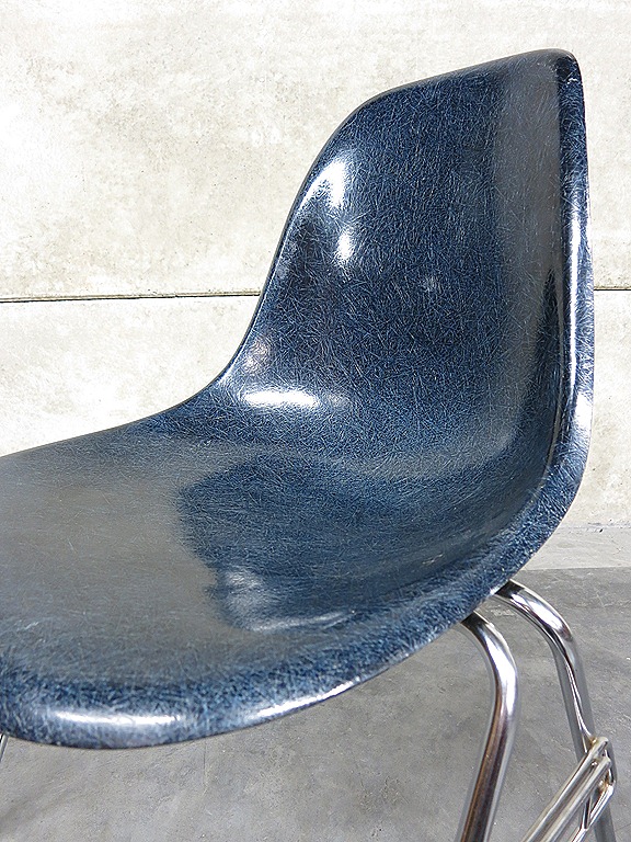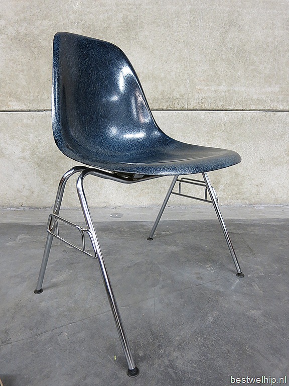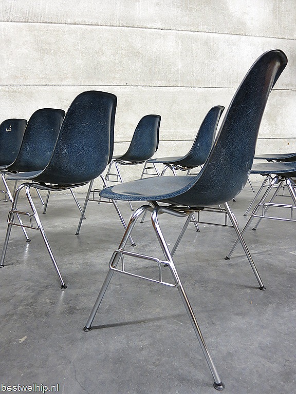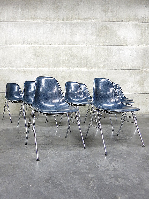 Absoluut uniek in deze bijzondere kleurstelling ‘navy blue’, de originele vintage glasfiber kuipstoelen van Miller. Prachtige & tijdloze originele vintage originals… de Eames eetkamer stoelen, uniek met originele fiberglas kuip en metalen chromen onderstel. Een tijdloos ontwerp van Charles en Ray Eames. Fabrikant: Herman Miller. Land van herkomst: America. Periode: 1950. Uitgevoerd in een zeldzame blauwe kleur. Deze stoelen zijn stapelbaar dus makkelijk op te bergen. Ook wel ‘the dining sideshell stacking chairs’ genoemd. Gezien de leeftijd nog in goed gebruikte vintage staat. En waar ze ook komen te staan…ze blijven gewoon ongekend mooi. In replica’s overal verkrijgbaar maar in origineel steeds zeldzamer. Ben jij de liefhebber die een echte originele set thuis wil hebben staan? Verkocht.