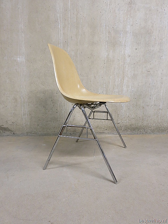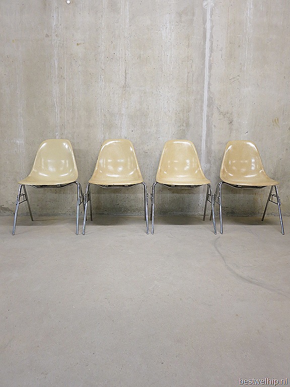 Prachtige & tijdloze originele vintage originals… de Eames eetkamer stoelen, uniek met originele fiberglas kuip en metalen chromen onderstel. Een tijdloos ontwerp van Charles en Ray Eames. Fabrikant: Herman Miller. Land van herkomst: America. Periode: 1950. Uitgevoerd in een mooi pastel geel. Deze stoelen zijn stapelbaar dus makkelijk op te bergen. Ook wel ‘the dining sideshell stacking chairs’ genoemd. Gezien de leeftijd nog in goed gebruikte vintage staat. En waar ze ook komen te staan…ze blijven gewoon ongekend mooi. In replica’s overal verkrijgbaar maar in origineel steeds zeldzamer. Ben jij de liefhebber die een echte originele set thuis wil hebben staan? Prijs: verkocht