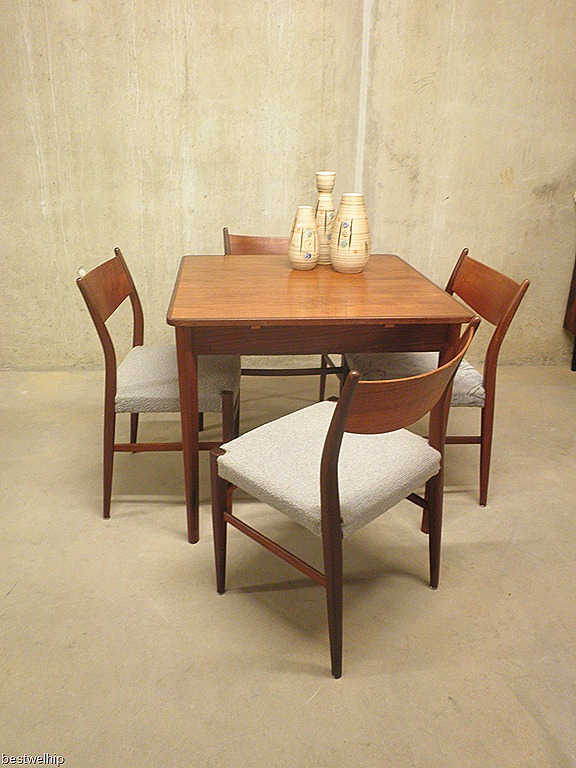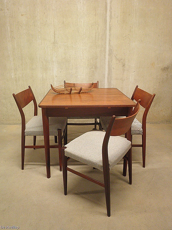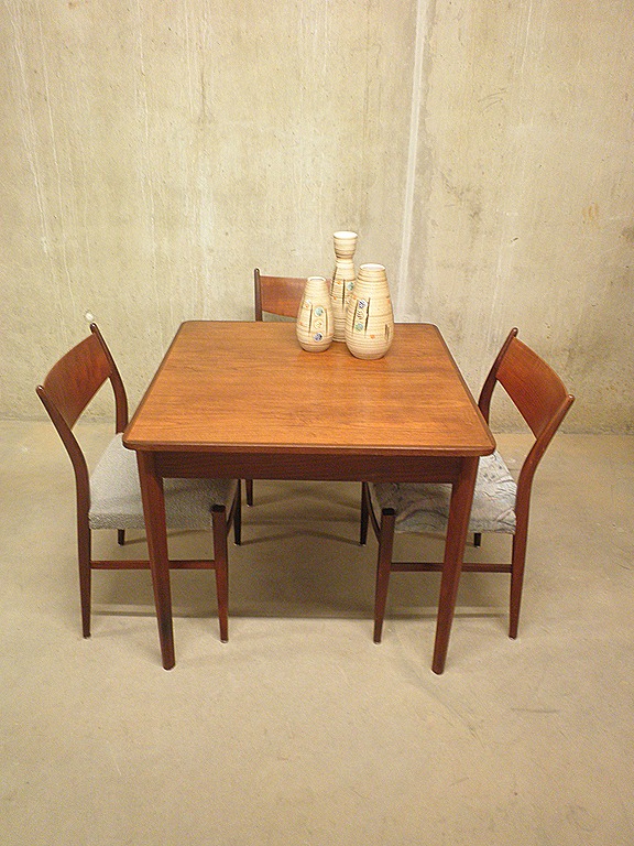 Prachtige originele vintage eetkamerset, dining set in Deense stijl. Periode: jaren 60. De tafel is compact en ruimtelijk door zijn ideale afmetingen (vierkant) Deze tafel is ook uitklapbaar ( zie middelste foto ) De stoelen zijn strak vormgegeven, 2 stoelen zijn in uni blauw bouclé gestoffeerd zijn/ 2 stoelen in print motief. Afmetingen tafel: B0.84 x L0.84 x H0.73 cm, uitgeklapt heeft de tafel een lengte van 1.35 cm. Afmetingen: B0.48 x D0.49 x H0.79 cm. Zithoogte is 0.45 cm, zitdiepte is 0.36 cm. Nog in zeer goede vintage staat. Prijs: verkocht
