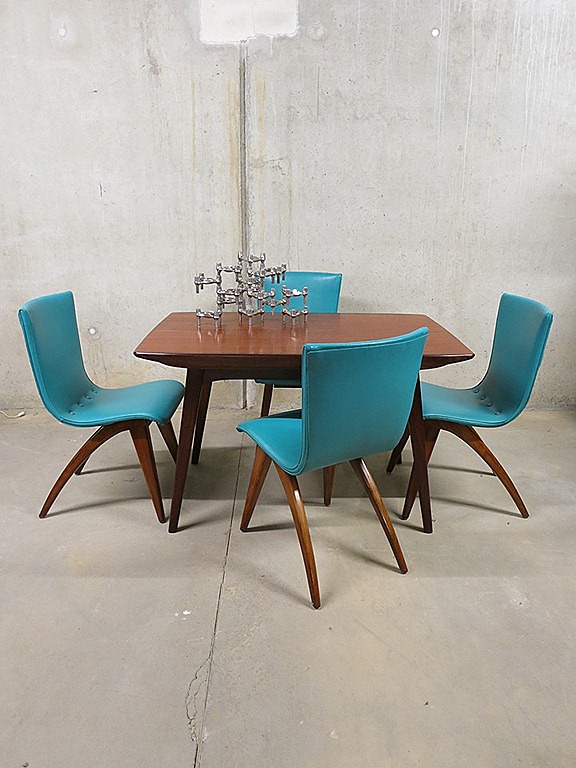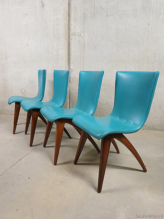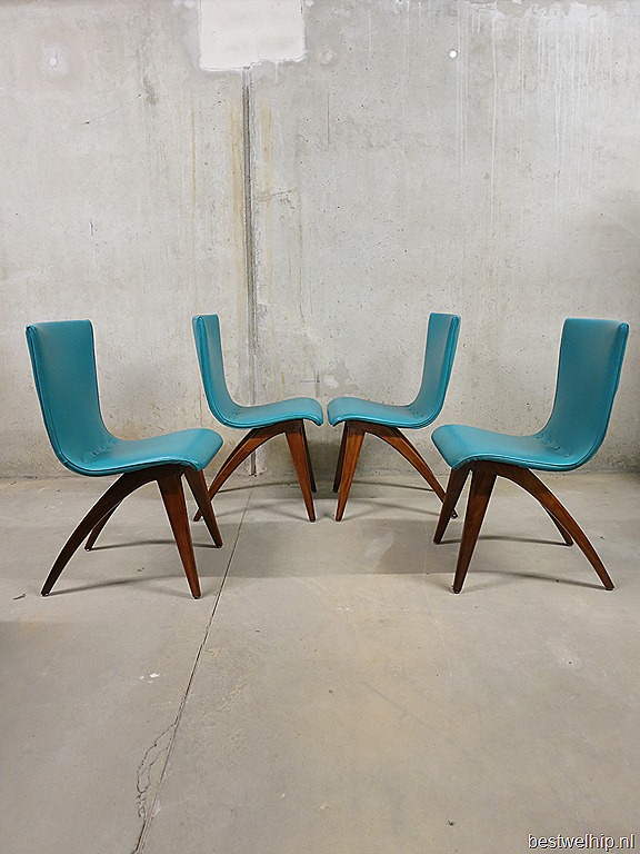 Vier bijzonder fraai vormgegeven vintage eetkamerstoelen van de Meubelfabrikant C.J van Os. Periode: jaren 50. Deze stoelen hebben een prachtige vormgeving met een in het oog springende teak houten onderstel. Gezien de leeftijd nog in goede vintage staat. Staan deze unieke vintage stoelen straks bij jou in huis te pronken? Prachtig in zowel een modern als vintage interieur. Prijs stoelen: verkocht