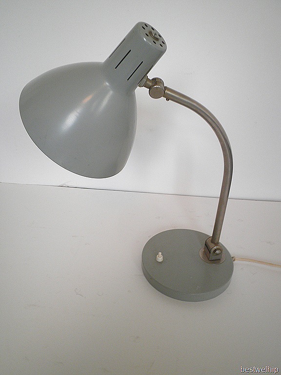 Een bijzondere vintage bureaulamp met een stoere industriële uitstraling van het merk Hala Holland, Zeist. Periode: jaren 60. Kleur: mat (midden) grijs. Deze lamp is nog voorzien van een originele sticker aan de binnenkant van de kap. Verstelbaar is verschillende hoogte en standen en voorzien van een aan/uit schakelaar. Gezien de leeftijd nog in zeer goede vintage staat met minimale gebruikssporen. Zoek jij nog een bijzonder exemplaar voor op je bureau of voor op de tafel?