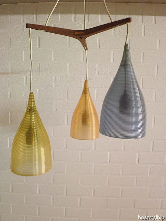 Vrolijke hanglamp/ luster met houten ‘boemerang’ en kunststof gekleurde kelken. Periode: jaren 60. Dit type lamp kom je vaker tegen in de Scandinavische landen. De houten ‘boemerang’ zorgt ervoor dat de lampen op willekeurige hoogte gehangen kunnen worden/ verstelbaar Materiaal: geribbeld kunststof kap ( lijkt op een afstandje op glas), houten ‘boemerang’. Kleuren: geel, oranje, blauw. Nog in zeer goede vintage staat. Leuk voor in de hal of boven de tafel. Prijs: verkocht