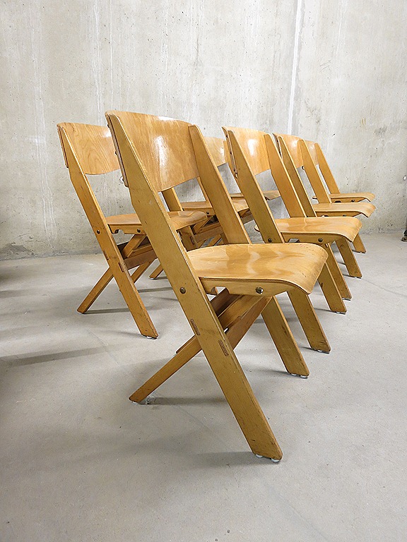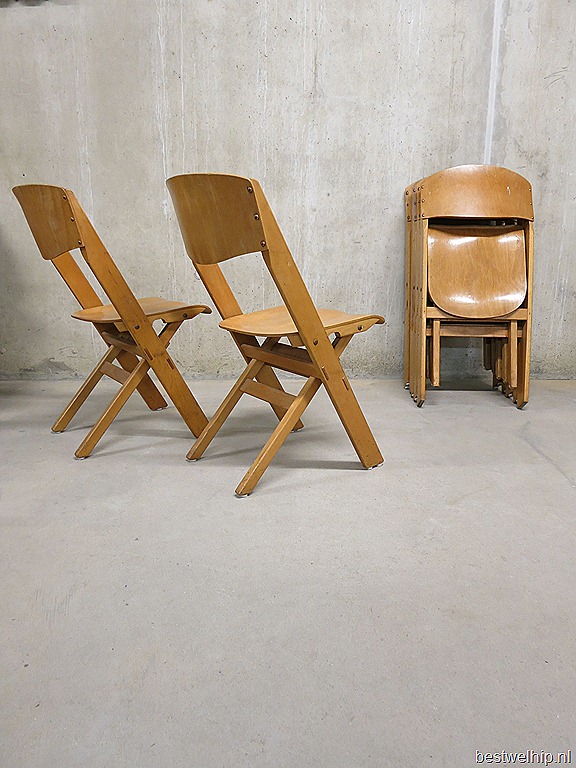 Een stoere partij/ lot vintage klapstoelen ( 7 stuks) in een zeer mooie gestroomlijnde vorm. Periode: jaren 60. Materiaal: plywood in berken kleur. Afmetingen: B0.44 x D0.49 x H0.81, zithoogte 0.47 cm. Gezien de leeftijd in goed gebruikte vintage staat. Door zijn prachtige vormgeving toch net anders dan al die andere klapstoelen. Ideaal om bij te zetten voor binnen en buiten. Open jij binnenkort een bar/ terras dan zijn dit wellicht de stoelen die je zoekt? Makkelijk stapelbaar, een echte ruimte bespaarder als je ze opklapt & stapelt. Prijs: verkocht
