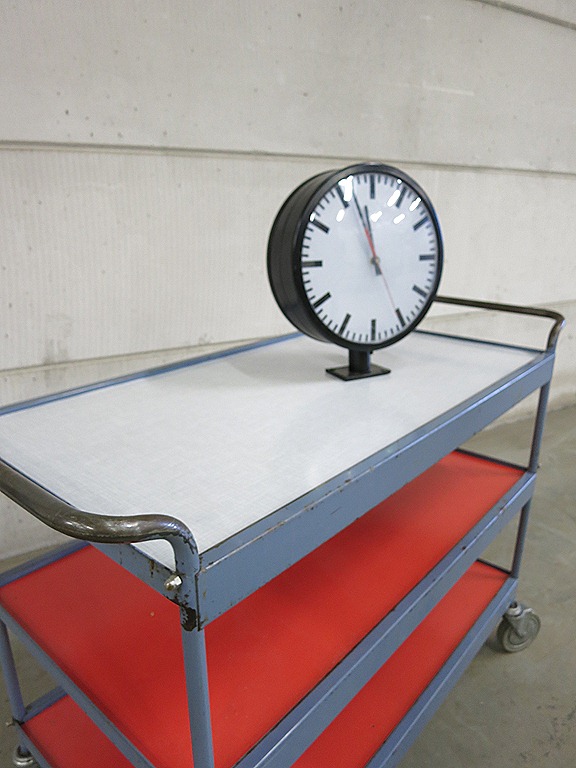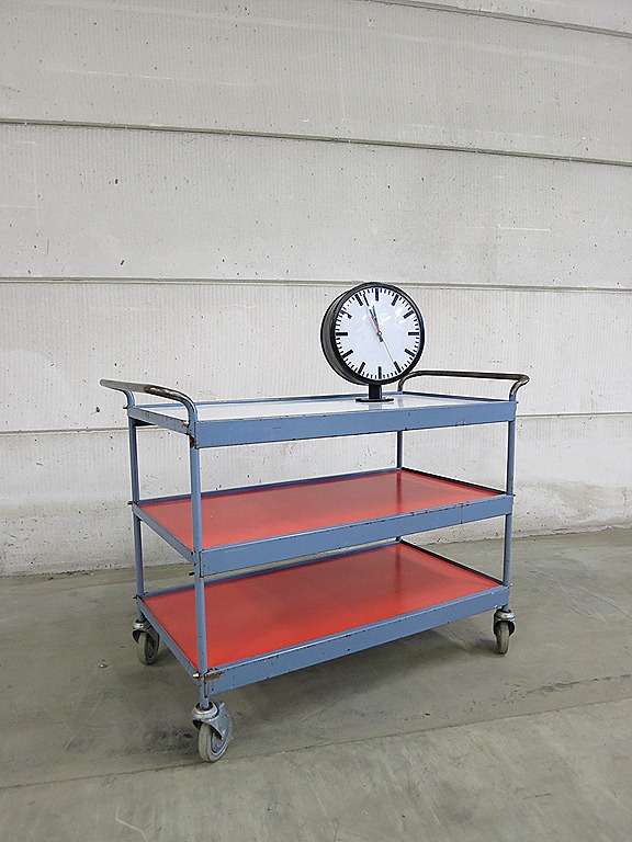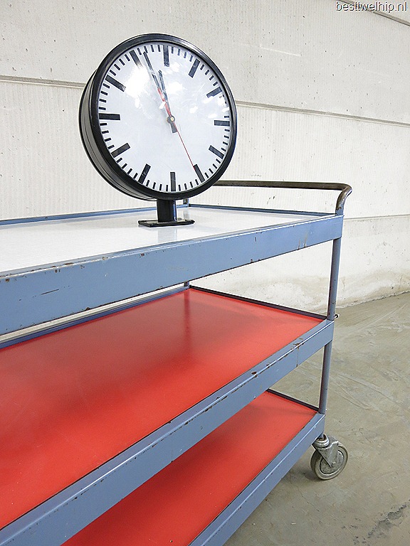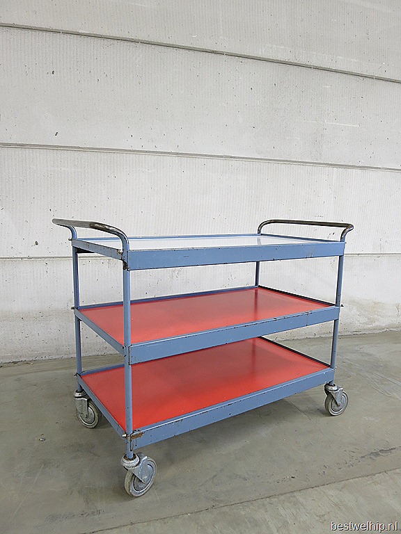 Dont miss this one…. stoere industriële serveerwagen uit de jaren 60. Materiaal: metalen frame, voorzien van 4 zwenkwielen en 3 formica legtableau ’s . Afmetingen: B1.15 x H0.88 x D0.54 cm, afmetingen blad 1 meter x D0.50 cm. Gezien de leeftijd nog in zeer goede vintage staat. Prachtig ter decoratie in een winkel om kleding of boeken op te presenteren. Ook ideaal om te gebruiken in een hotel, restaurant, bar of gewoon thuis voor in je keuken.