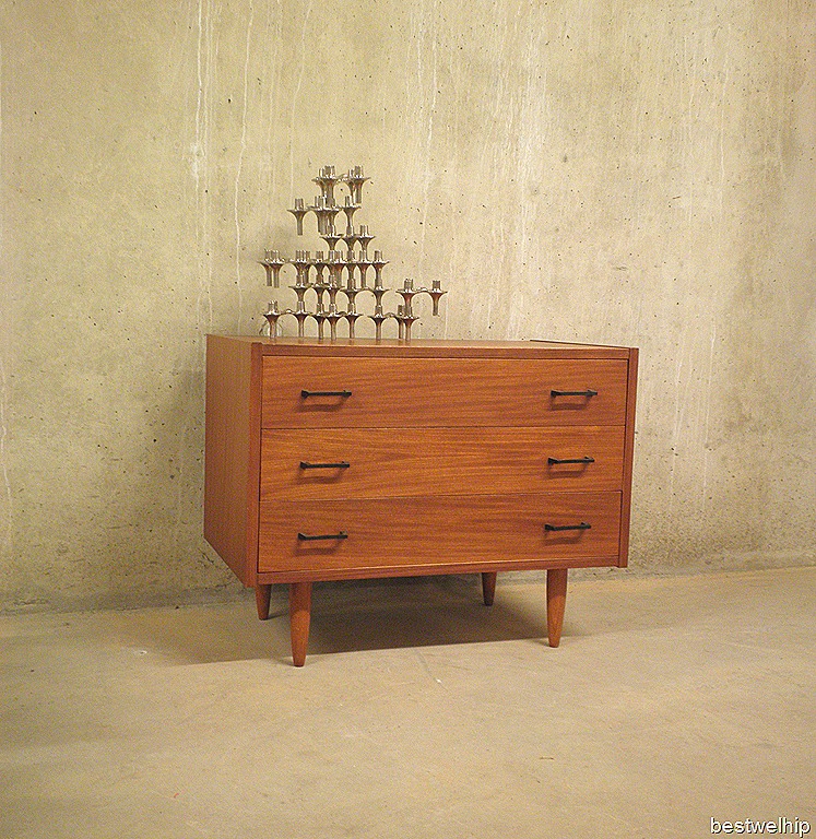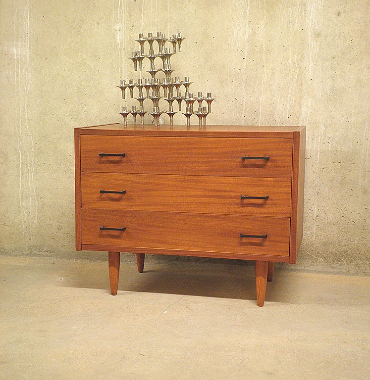 Strak vintage ladenkastje in Deense stijl. Materiaal: teak hout. Merk: onbekend. Periode: jaren 60. Zeer mooi exemplaar door zijn strakke lijnen & houttekening. De lades zijn voorzien van strakke metalen handgrepen. Afmetingen: B65 x D37 x H51. Gezien de leeftijd nog in goede vintage staat. Prachtig in de woonkamer om je tv op te zetten. Uiteraard ook gewoon leuk voor aan de wand met een vaas of kandelaar. Prijs: verkocht