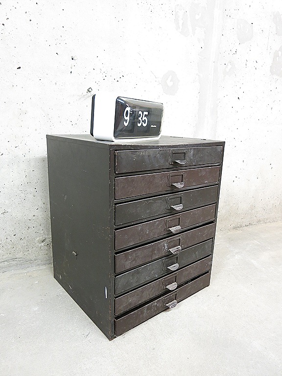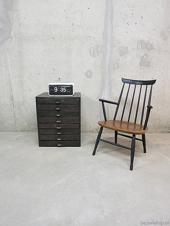 Stoer & strak metalen ladenblok met bijzondere in het oog springende handgrepen. Periode: jaren 50/60. Afmetingen: B51 x D45 x H61 cm. Gezien de leeftijd in gebruikte vintage staat, dit geeft het product alleen maar meer karakter. Ideaal om je papier in op te bergen. Of gewoon leuk om te gebruiken als bijzettafel in de living. Staat dit stoere exemplaar straks bij jou thuis? Prijs: verkocht