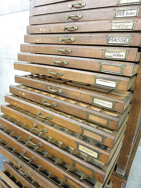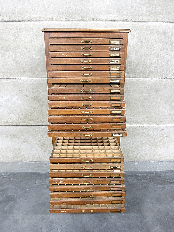 Mooie oude (jaren 60) letterkast Periode: jaren 50/60. Materiaal: hout met metalen grepen. De ladenkast is voor vele doeleinden te gebruiken, bijvoorbeeld kralen, verzamelingen, hobby-artikelen. De ladenkast bestaat uit vele lades met vakverdeling. Deze bestaat uit 2 losse delen, zowel op elkaar als naast elkaar te stapelen. Afmetingen: H0.80 x D0.61 x B0.64, afmeting lade breedte 0.53 x hoogte 0.04 cm. Gezien de leeftijd in gebruikte vintage staat. Een zeldzame kast met karakter. Staat deze straks bij jouw in de kamer te pronken? Uiteraard ook mooi voor in je winkel. Ook ideaal voor het sorteren van kralen, fossielen, muntstukken, schelpen…etc. Prijs: verkocht
