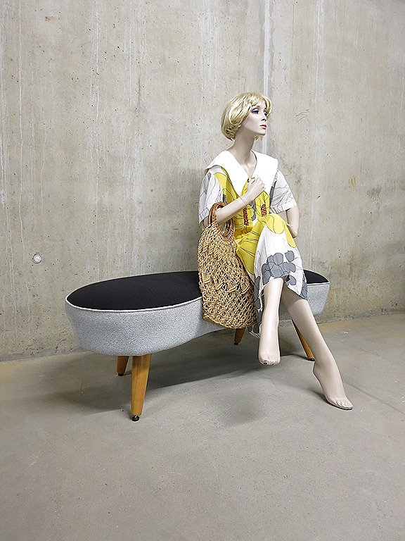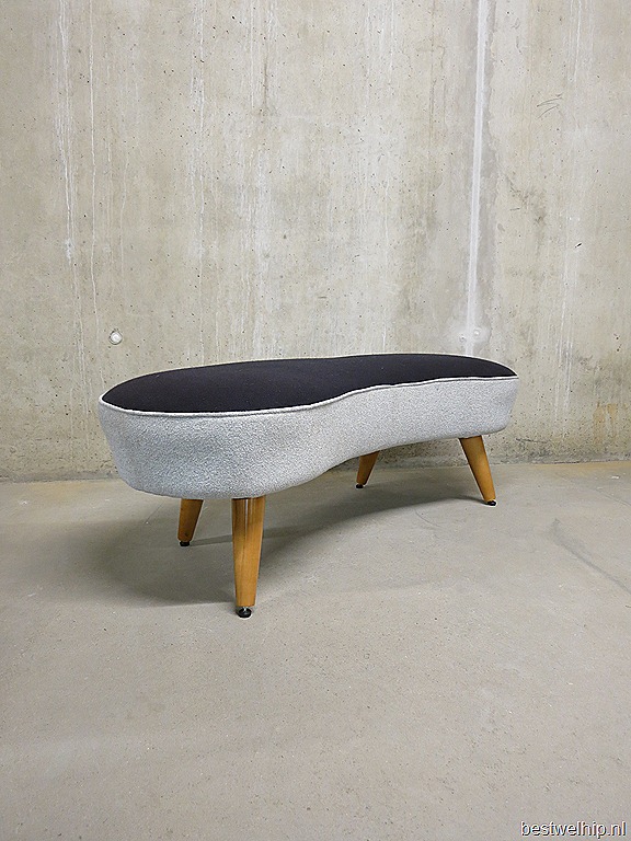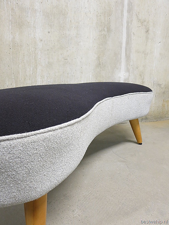 Mooi door zijn eenvoud, deze elegante vintage niervormige bank/ sofa. In de stijl van Vladimir Kagan. Ideaal om bij te zetten in de ruimte door zijn bescheiden afmetingen: B1.41 x D0.53 x H0.44 cm. Prachtige karakteristieke stof in bijzondere blauwtinten. Nog in zeer goede vintage staat. De taps uiteenlopende beukenkleurige houten poten maken deze lounge bank tot een eye-catcher!  Prachtig om neer te zetten in een winkel, lobby van een hotel en uiteraard voor in huis. Ook handig om te gebruiken als Ottoman bij je bank en heerlijk onderuit zakken & relaxen maar…. Laat die knusse winter maanden maar komen! Prijs: verkocht