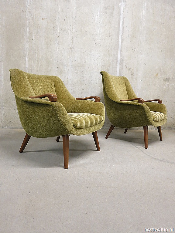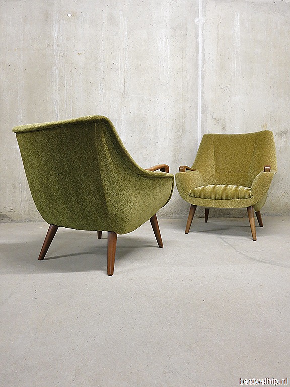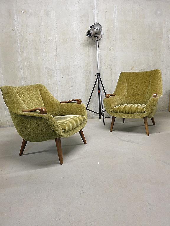 Twee unieke prachtige vintage lounge fauteuils/ club fauteuils. Bijzonder omdat het een mannetjes & vrouwtjes fauteuil betreft. Periode : jaren 50. Prachtige vormgeving met zeer aparte armleuningen ( Deense stijl) Prachtige soft tonen in olijf kleur. Nog in zeer goede vintage staat. Handige bijkomstigheid, deze stof kwaliteit is ook katten en honden ‘proof’. Ideaal om neer te zetten in de living of in een lounge bar. Absoluut een eye-catcher en heerlijke fauteuils om in te relaxen! Prijs: verkocht