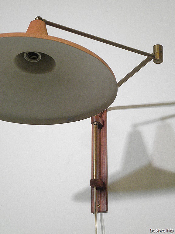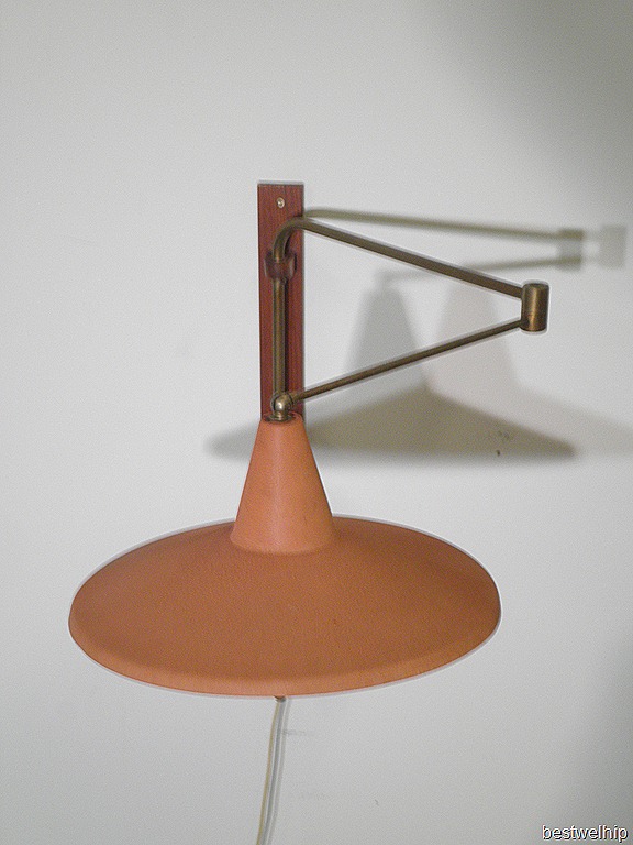 Super strakke wandlamp met industriële ‘allure’. Een verstelbare metalen wandlamp waar zowel de arm als de kap draaibaar/kantelbaar is en in alle richtingen te plaatsen is. Vermoedelijk een lamp van Nederlandse afkomst (Anvia?) Het ontwerp van deze lamp doet veel denken aan de alom bekende Gispen Panama lamp van Wim Rietveld. Deze vintage wandlamp heeft een metalen kap, nog voorzien van een originele porseleinen fitting, een metalen arm en een houten muur bevestigingsplaat. Afmetingen: diameter kap 36 cm, lengte arm gestrekt 71 cm inclusief kap 92 cm. Periode: jaren 50. Gezien zijn leeftijd nog in zeer goede vintage staat. Echt een lamp voor de industriële design liefhebber/ verzamelaar. Prijs: verkocht