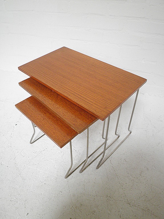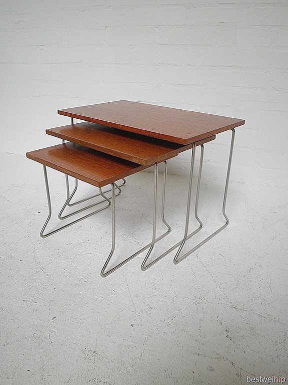 Prachtige set vintage nesting tables, met houten blad en strakke chromen poten. Periode: 1960. Afmetingen: B50xD30xH35 & B40xD27xH31 & B30xD30xH27 cm. Tijdloos en mooi in zowel een vintage- als een modern interieur. Heb jij de perfecte plek voor deze hippe miniset bijzettafel? Gezien hun leeftijd nog in goede vintage staat (enige/minimale vintage sporen aan het hout) Prijs: verkocht