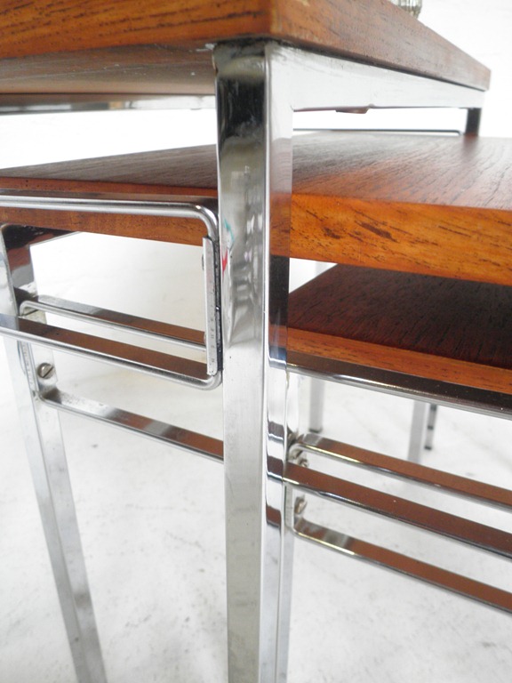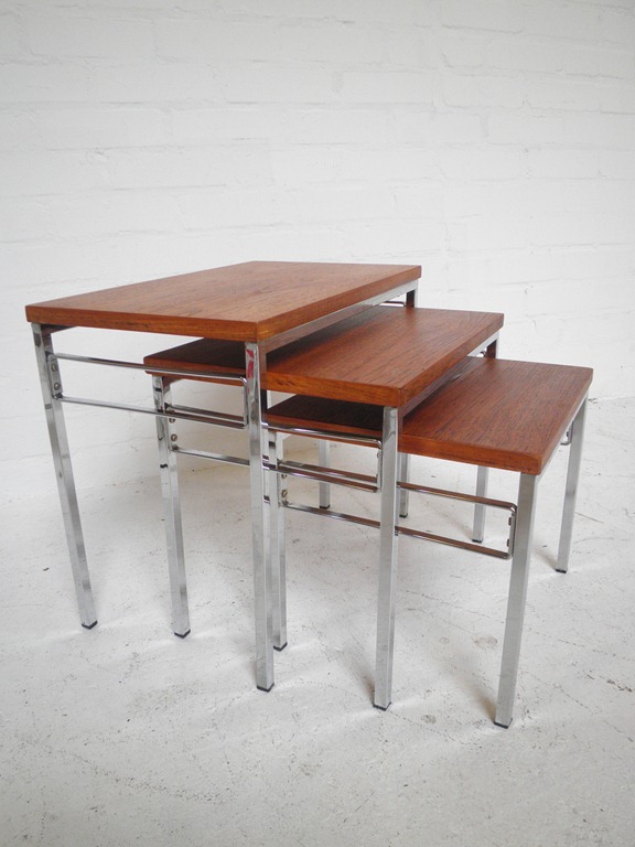 Prachtige strakke miniset, typisch jaren 60. De combinatie van hout met chroom geeft deze miniset een frisse en moderne look. Afmetingen: B50 & B43 & B36 cm, diepte van alle tafeltjes is 30 cm, H42 & H36 & H30 cm. Gezien de leeftijd van deze ‘nesting tables’ nog in zeer goede vintage staat met minimale gebruikerssporen. Zeer bijzonder chromen onderstel, zeer stijlvol. Prijs: verkocht