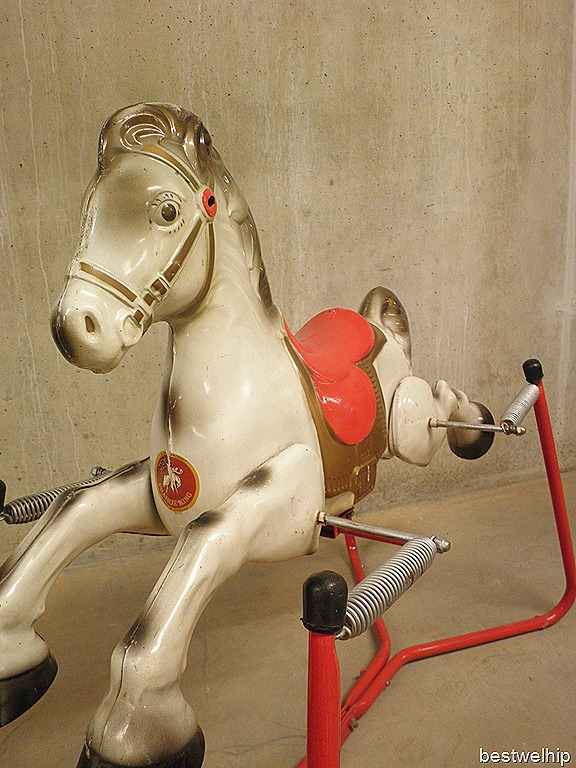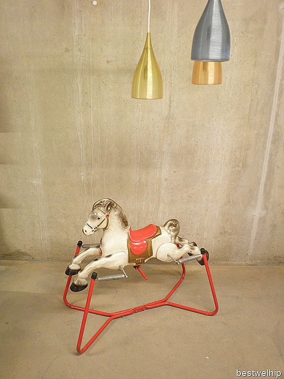 Een prachtig zeldzaam vintage hobbelpaard voor de kids of gewoon als woondecoratie in je huis of verzamelobject! Periode: 1950. Merk: Mobo ‘Prairie King’ spring horse ( voorzien van originele sticker aan de voorkant) Geproduceerd in Eirth, Kent Engeland. Materiaal: tinnen paard met een metalen frame. Voor die tijd al een zeer vooruitstrevend object/ design voor zowel binnen als buiten. Absoluut een eye-catcher door zijn prachtige kleuren. Gezien zijn leeftijd nog in zeer goede vintage staat. Ben jij nog opzoek naar dat ene originele cadeau voor de feestdagen? ‘A Vintage treasure for your home’ Prijs: verkocht