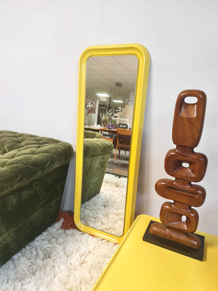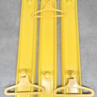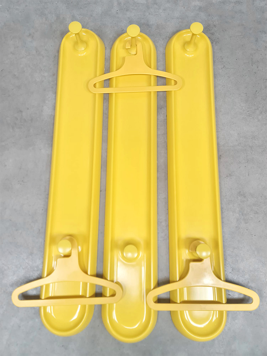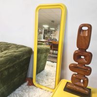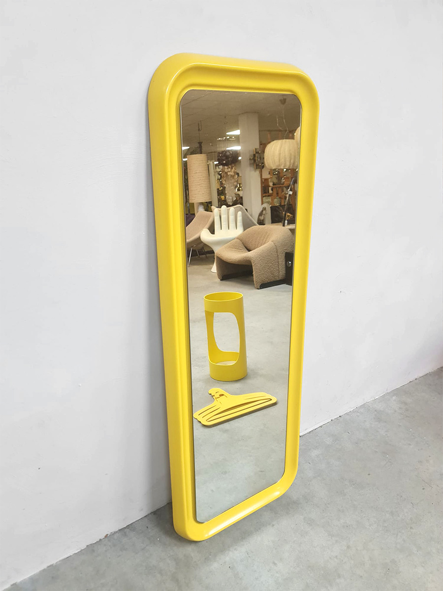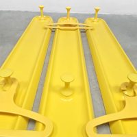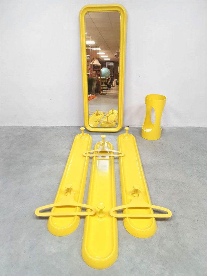 Mello yellow! Color up your room. Een stijlvolle en zeldzame Space Age halset / kapstok set uit de jaren ’70, ontworpen door Jürgen Lange voor Schönbuch. Deze Quadro set bestaat uit een groot ovaal spiegel, 3 kapstokken met bijbehorende kapstokhangers en een bijpassende paraplubak in geel kunststof. Een functioneel ontwerp met een futuristische uitstraling. Alle nog in een zeer goede vintage staat. Een echte blikvanger voor de moderne of vintage interieur hal. Uniek in deze complete set.
