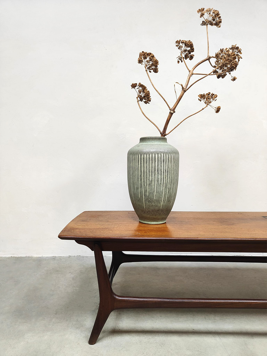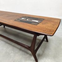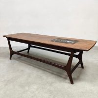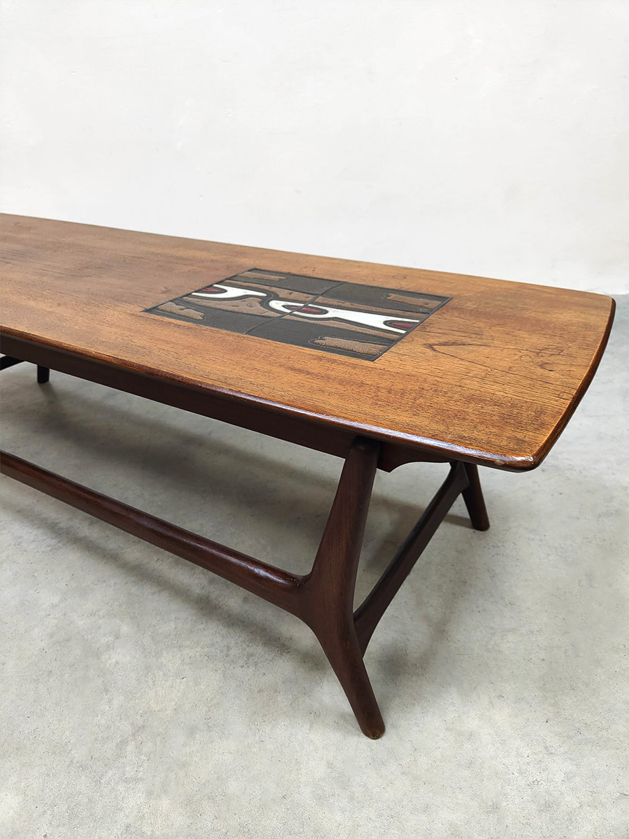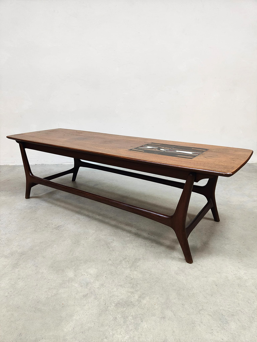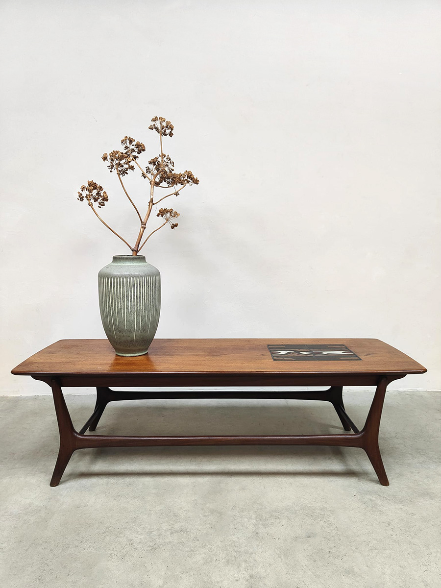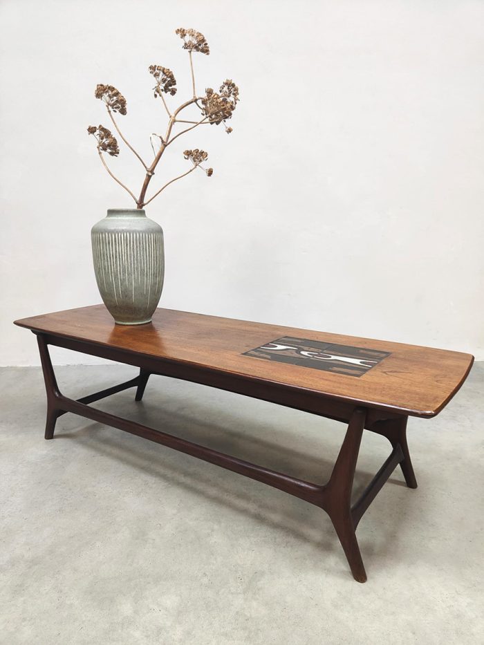 Doet deze stijlvolle vintage teak houten salontafel jou hart ook sneller kloppen? Een ontwerp van Louis van Teeffelen voor Webe. Periode: jaren 60. Het prachtige mozaïek detail en organische vormen maken deze tafel tot een bijzonder exemplaar. Het tafelblad is ingelegd met een prachtige Jaap Ravelli tegel waarmee Webe in de jaren 60 veel deed samenwerken. Deze unieke salontafel is een mooie aanvulling in je interieur. Gezien de leeftijd nog in een goede vintage staat. Ben al een hele tijd opzoek naar deze bijzondere salontafel? I love this vintage Dutch design coffee table!