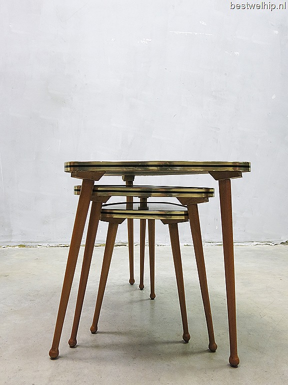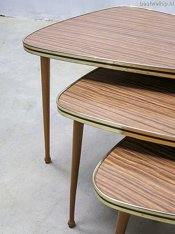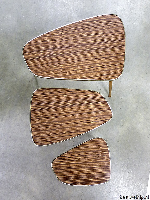 Bijzondere authentieke miniset, 3 bijzettafeltjes/ plantentafeltjes met taps uitlopende cocktail poten en een strak formica blad in Zebrano print. Periode: jaren 60. Bijzonder door de typische a-symmetrisch bladen. Door de materiaalkeuze een stoere miniset met een warme look. Door de gelamineerde bovenbladen ideaal omdat deze geen kringen vormt, makkelijk afveegbaar. Afmetingen: H35 x B50 x D32 / H30,5 x B39 x D26 / H26 x B28 x D21 cm. Gezien zijn leeftijd absoluut nog in goede vintage staat. Past deze set perfect in jou woonkamer? Prijs: verkocht