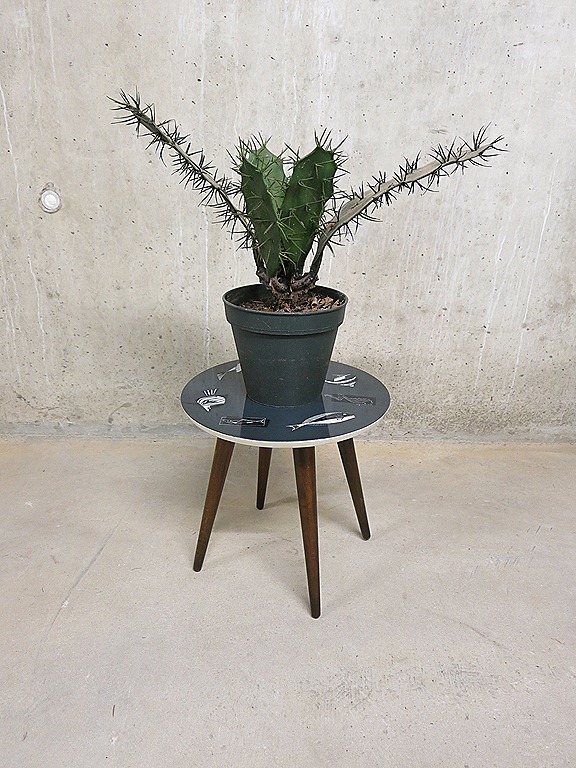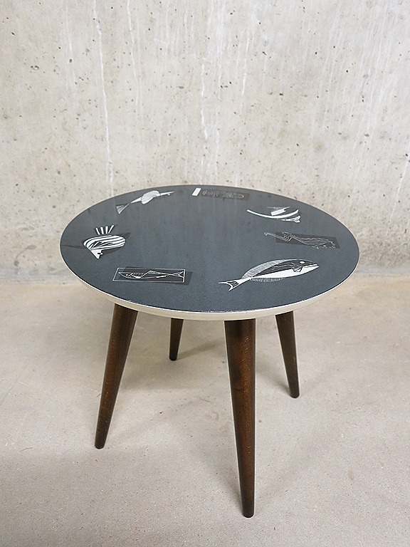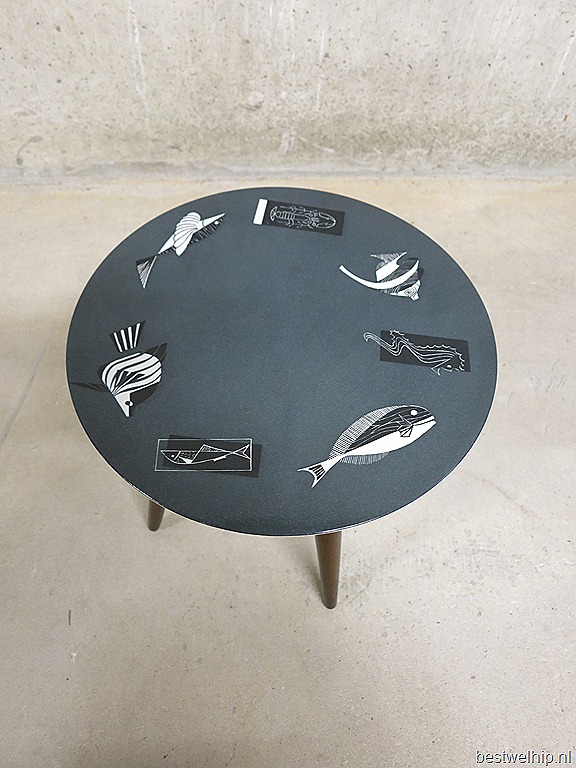 Zeer bijzonder vintage plantentafeltje (laag) Het blad is van gelamineerd formica (kunststof), voorzien van een abstracte vissen print. De cocktail poten zijn van hout. Merk: Plastilan. De onderkant is gemerkt. Land van herkomst: Duitsland (Sudern Sauerland) Periode: jaren 50. Gezien de leeftijd nog in zeer goede staat. De print doet denken aan de graficus Maurits Cornelis Escher. Zoek jij net dit speciale plantentafeltje?