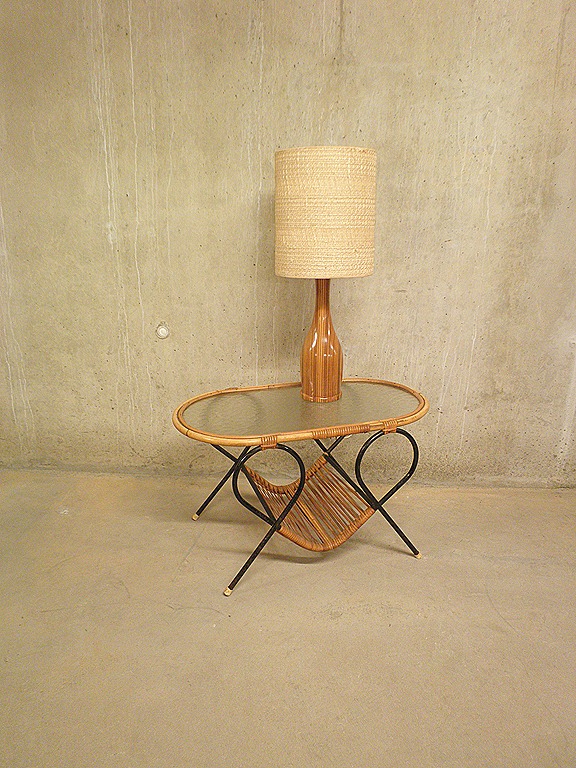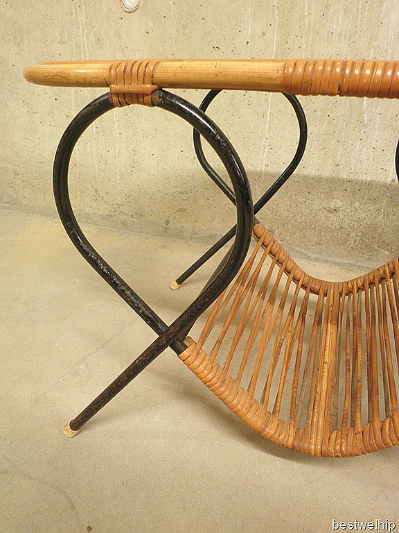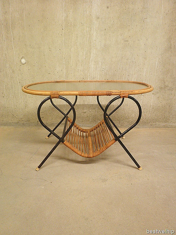 Zeer bijzonder vormgegeven rotan salontafel/ bijzettafel van Rohe Noordwolde. Periode: jaren 50/ 60 Materiaal: rotan (rotanpalm) met gebogen metalen frame en glazen blad. Nog in goede vintage staat. Zeer bijzonder frame in een hart vorm met handige bijbehorende lectuurbak. Prachtig om neer te zetten in huis. Prijs: verkocht