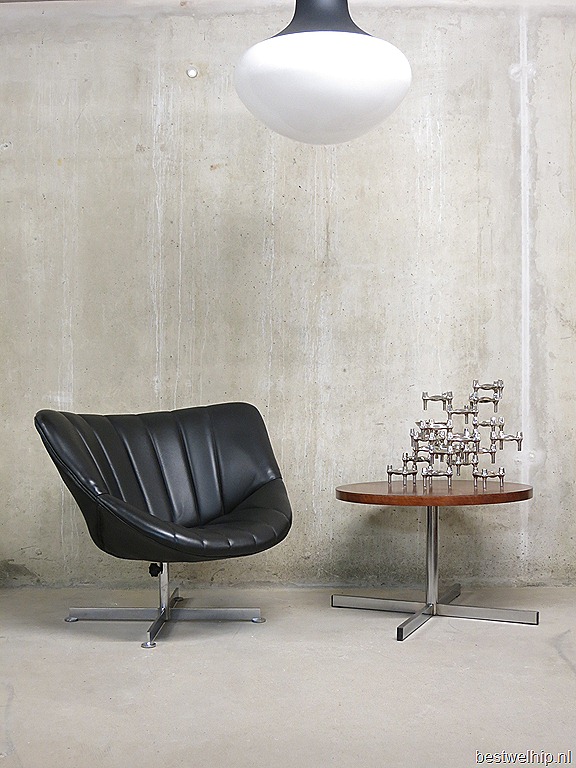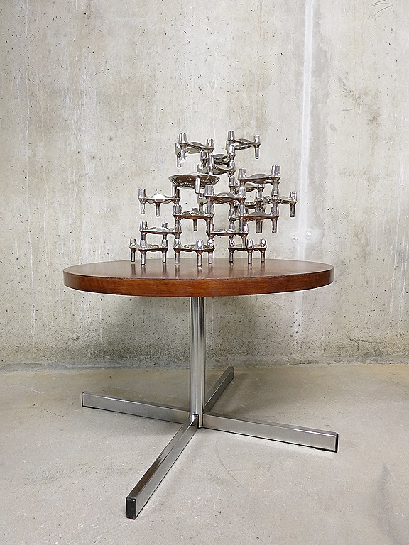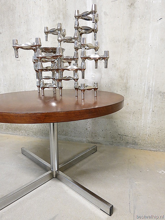 Prachtige stijlvolle salontafel uit de jaren 50/60. Mooie zware chromen ster poot met houten blad. Door zijn beperkte afmetingen makkelijk bij te zetten in iedere ruimte. Afmetingen: hoogte is 0.48 cm, diameter blad 0,71 cm. Gezien de leeftijd nog in zeer goede vintage staat. Een prachtige combinatie tussen het zwaar metalen chromen onderstel en het warme houten blad. Prijs: verkocht