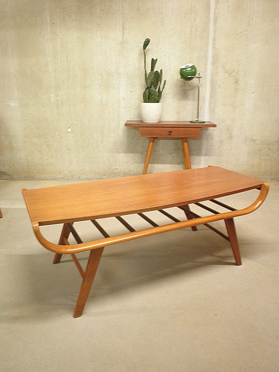 Strakke mooi vormgegeven salontafel in Scandinavisch/ Deense stijl. Periode: jaren 60. Ontwerper: onbekend. Materiaal: teak hout. Mooi houten frame met omkeerbaar blad zodat het aan twee kanten gebruikt kan worden.. De ene kant is teak de ander kant is wit formica. Onder het tafelblad is er plek voor lectuur. Door zijn beperkte afmetingen: B 1.01 x D94 x H46 cm makkelijk te plaatsen in elk interieur. Gezien de leeftijd in goede vintage staat. Is jou oog gevallen op dit leuk exemplaar? Een aanwinst voor je interieur. Prijs: verkocht