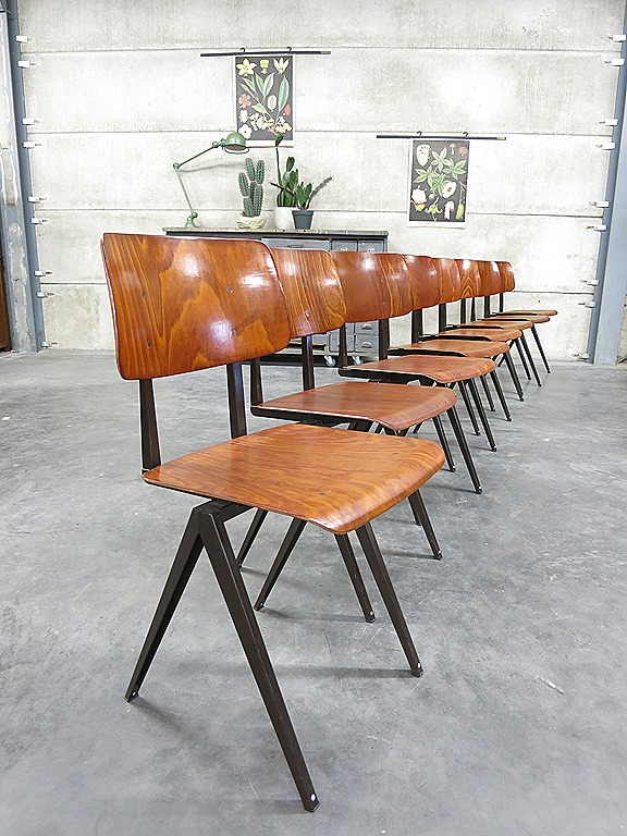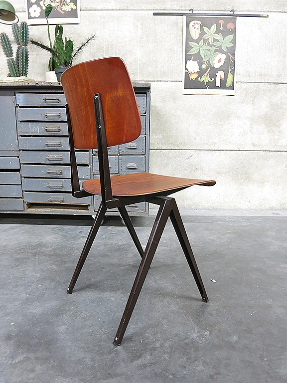Stoere industriële vintage schoolstoelen. Periode: jaren 60. Merk: Galvanitas, ze doen ook een beetje denken Friso Kramer ‘result chair’. Materiaal: plaatstalen frame/ onderstel in U-profiel en een houten multiplex zitting/rug. Afmetingen: H 80 xB45 x D50 cm, zithoogte is 0,44 cm. In zeer goede vintage staat. Bijzonder door zijn stoere, industriële en bovenal tijdloze karakter. Prachtig om ze neer te zetten aan een mooie lange tafel of te gebruiken als bureaustoel. Prijs: verkocht