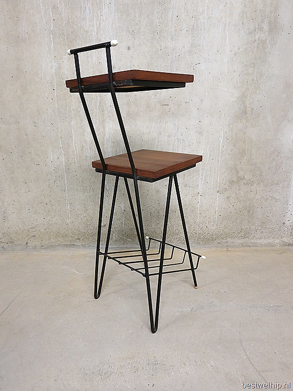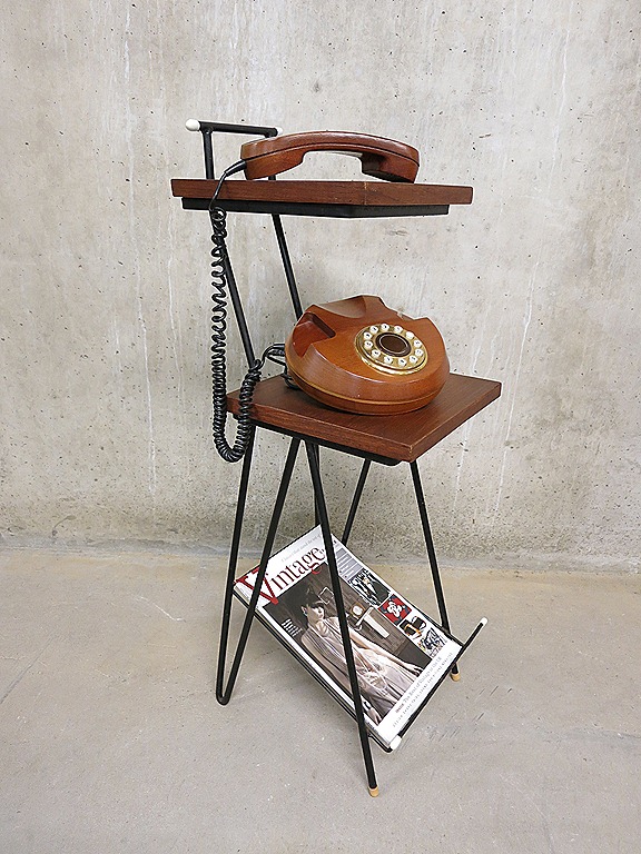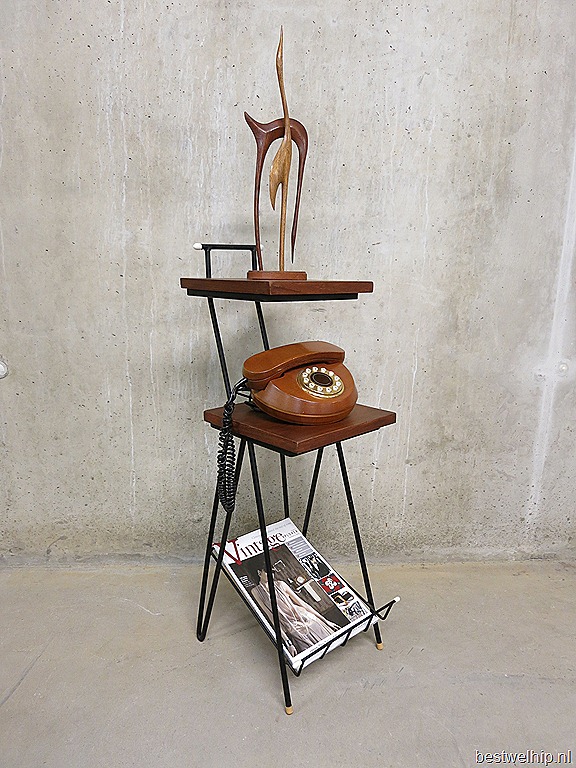 Alleen daarom wil je weer een telefoon in je living hebben staan… Aparte vintage bijzettafel en tijdschriften rek in een. Ook handig om neer te zetten naast die heerlijke lounge fauteuil. Of uiteraard ter aankleding van je bar/hotel/ winkel. Voor vele doeleinden te gebruiken. Periode: jaren 60. Ontwerper: onbekend, in de stijl van Pilastro. Materiaal: zwart metalen frame met teak houten plateau’s. Gezien de leeftijd nog in zeer goede vintage staat. Absoluut ‘one of a kind’ en een blikvanger. Prijs: verkocht