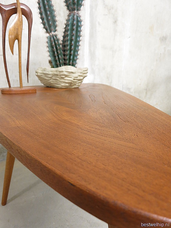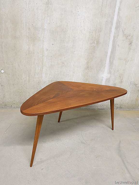Zeer mooie vormgegeven salontafel van Gelderland, Culemborg, Dutch design uit de jaren 50. Zeer bijzonder zwaar houten blad in de vorm van een triangel/ boemerang met taps toe lopende poten (demontabel) Afmetingen: B1.10 x D0.57 x H0.47 cm. Gezien de leeftijd nog in zeer goede vintage staat. Gewoon mooi door zijn eenvoud. Prachtig te combineren in zowel een modern als vintage interieur. Prijs: verkocht