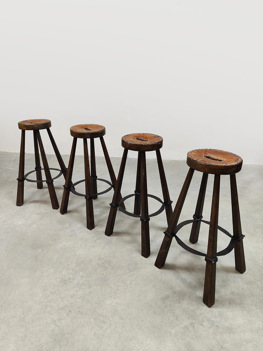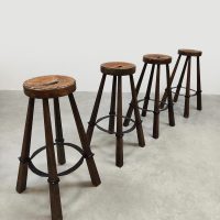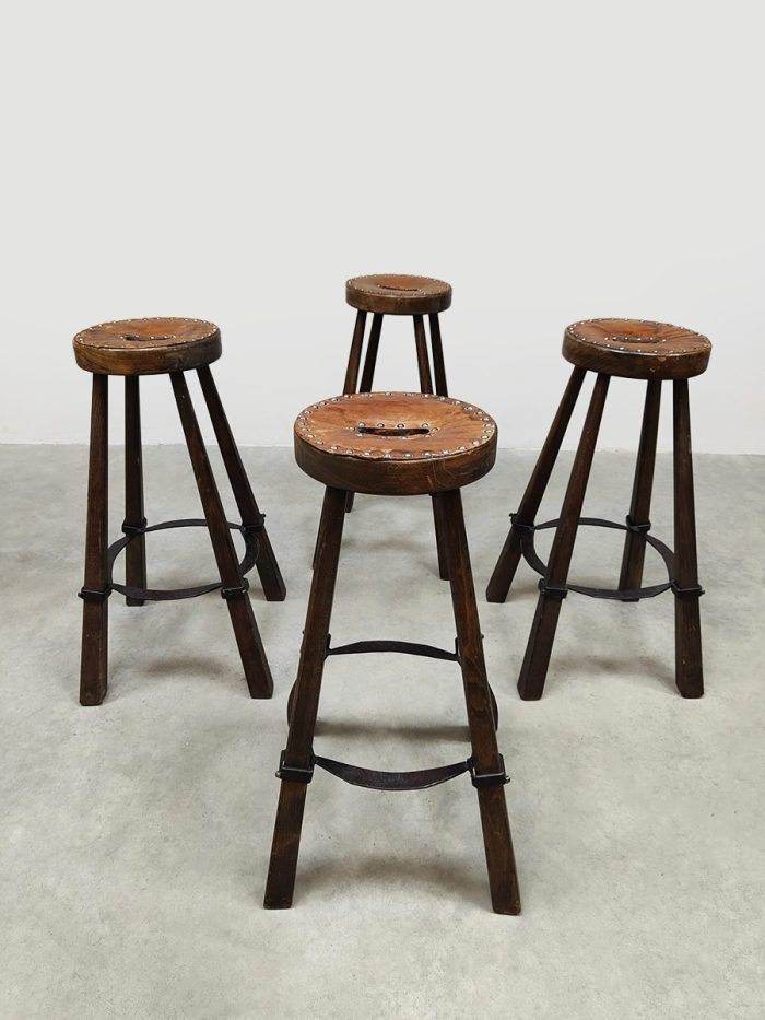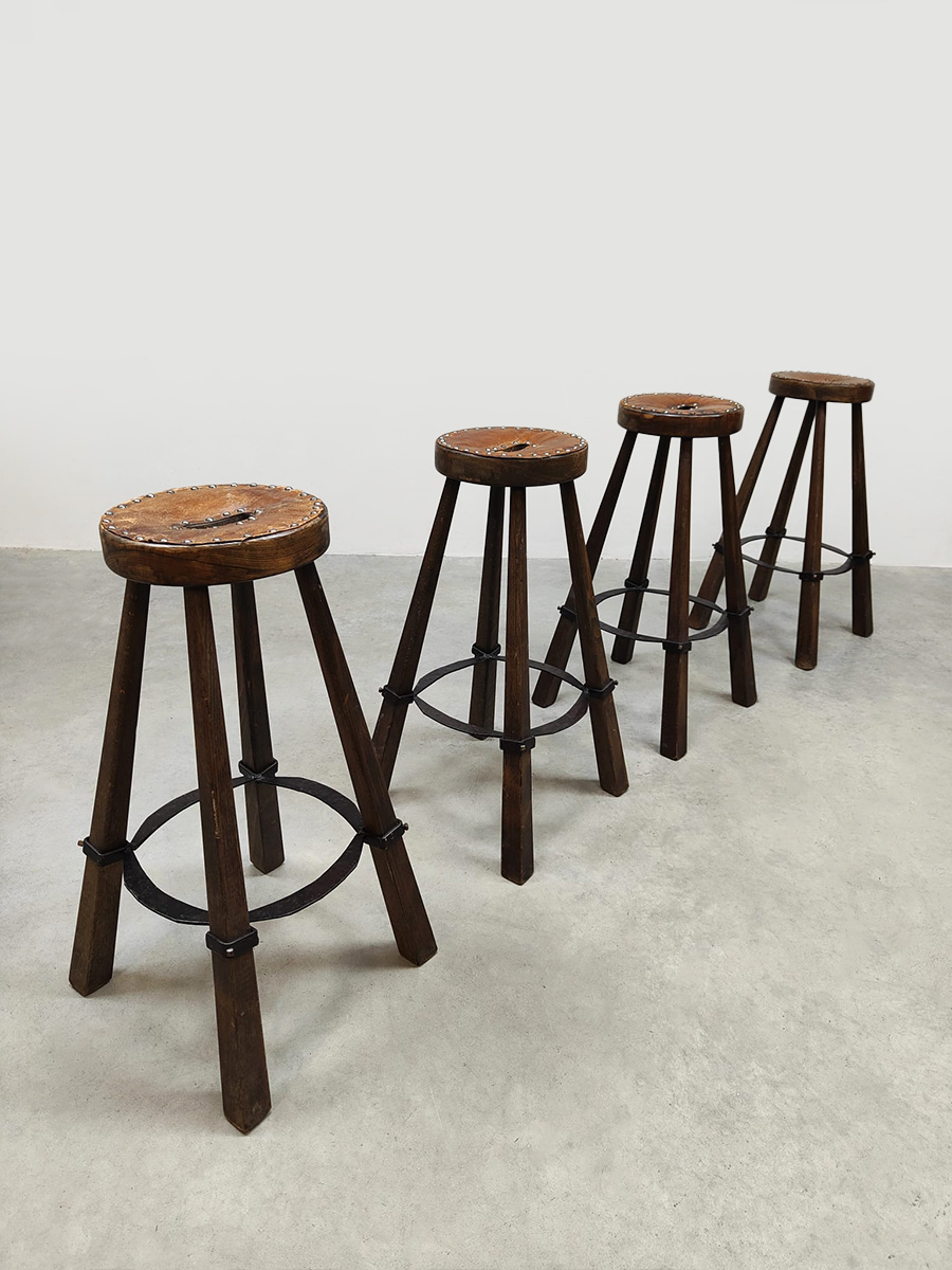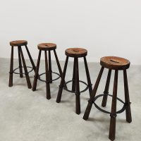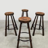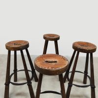 Four of a kind! Deze vier fantastische vintage brutalist krukken uit de jaren 70 zijn net even anders dan anders. Land van herkomst: Spanje. Deze stoere barkrukken zijn te gek voor aan de keukenbar, in een mancave of voor aan de bar van de lobby van ’n hotel. Door het stoere ontwerp en materiaalgebruik staan ze te gek in een modern als zowel vintage interieur. In goede gebruikte vintage staat. De geleefde leren zitting geeft net dat stoere karakter aan deze unieke krukken. Staan deze krukken binnenkort bij jou in huis te shinen. Dare to be different.