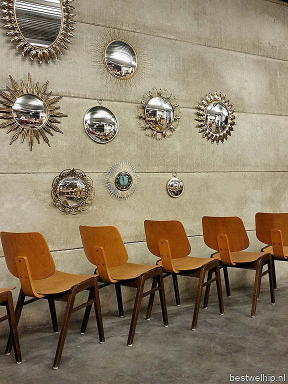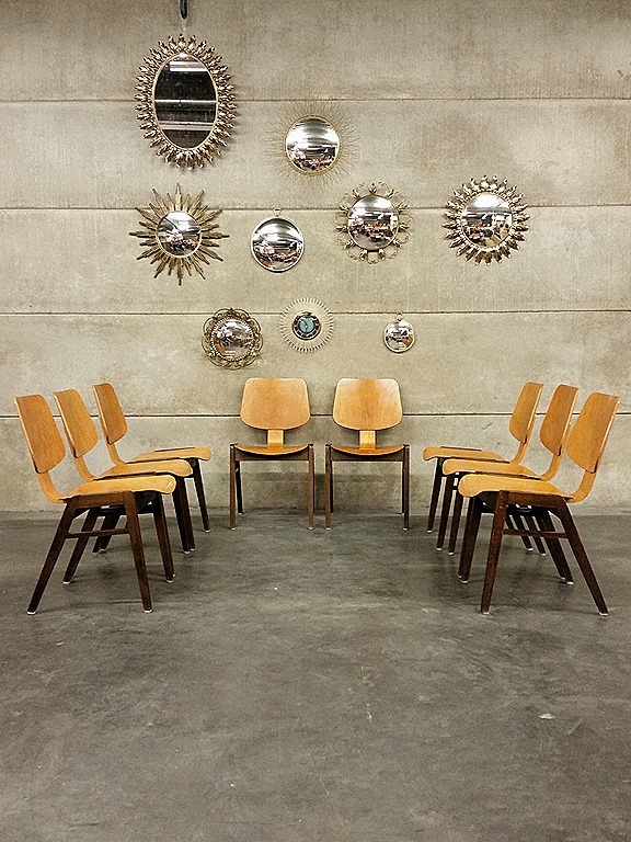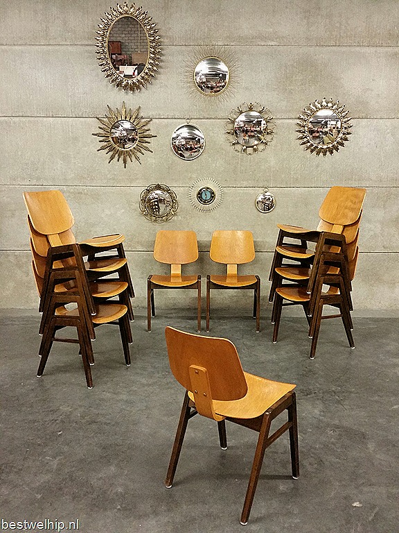 Uniek in zo’n grote partij! Deze prachtige vintage houten stapelstoelen in de stijl van Pastoe, Kees Braakman. Periode: jaren 50/60. Materiaal: 2 kleurig hout, beukenkleur in combinatie met donder teak hout. Gezien de leeftijd in goed gebruikte vintage staat. Prachtig om je restaurant mee aan te kleden. Uiteraard ook stoer voor bij je thuis aan een lange tafel. Mooi door zijn eenvoud maar ook door zijn strakke ronde vormen. Prijs: verkocht
